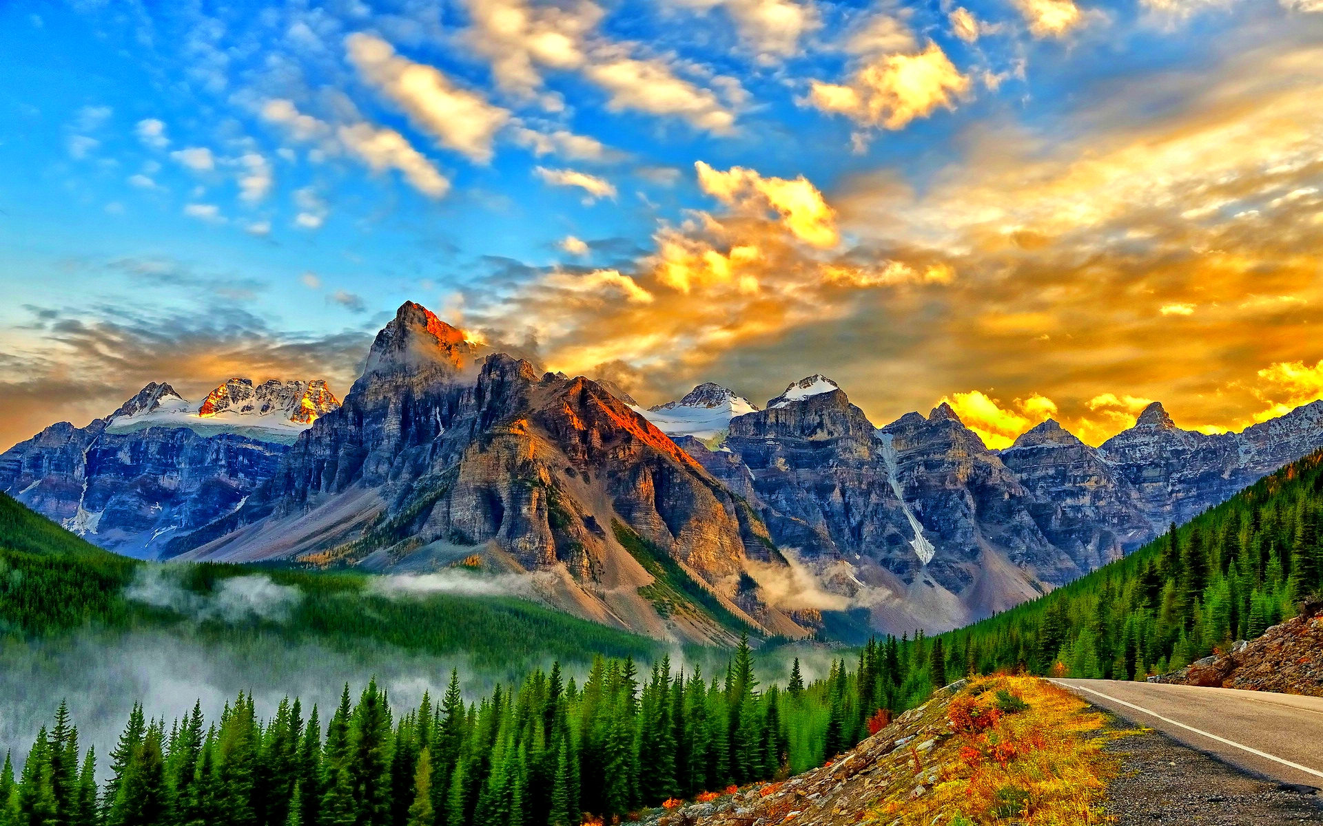 Description: A scenic view of a mountain range with a road going through it and a forest in the foreground.