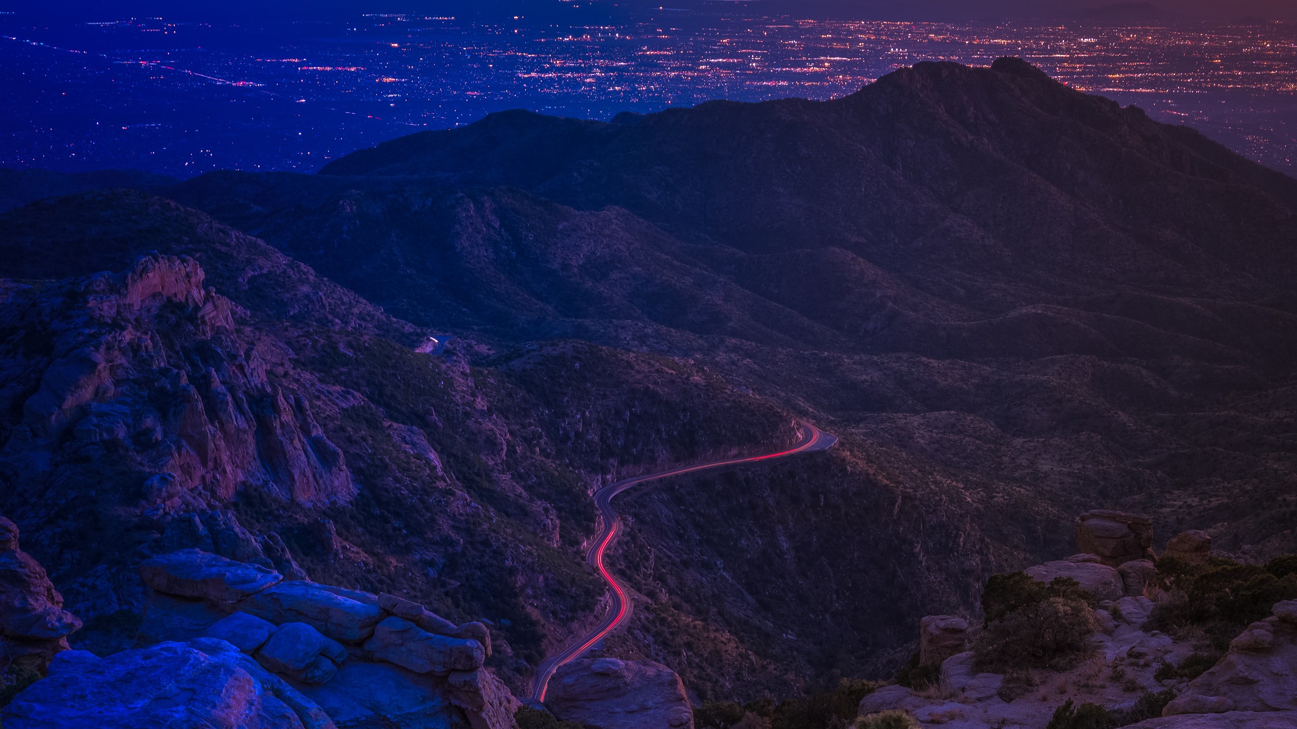 Description: A winding road winding through a mountainous area at night with lights on the mountains in the background and a city below.