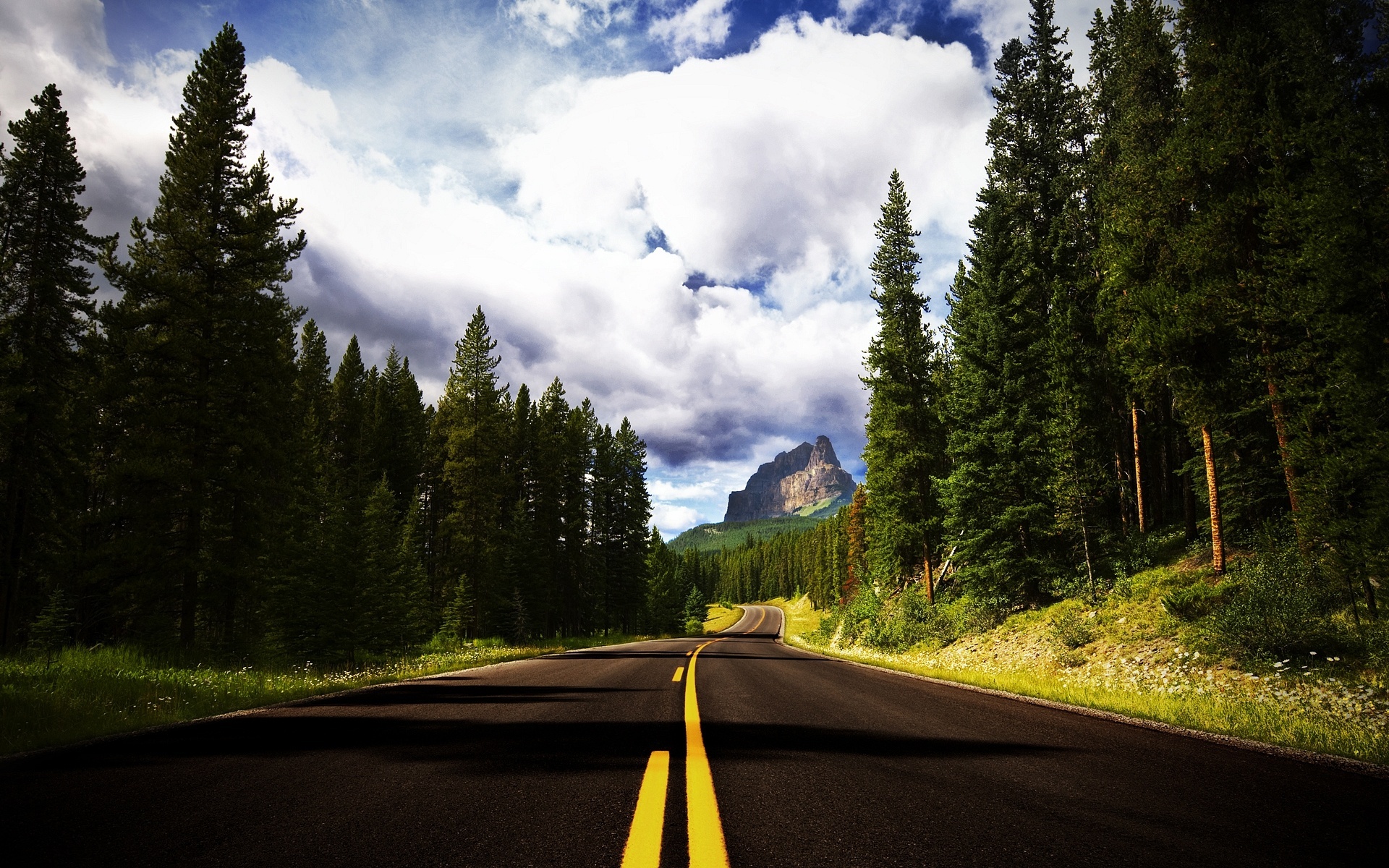 Description: A road with a mountain in the background and trees on both sides of it and a yellow line on the road.