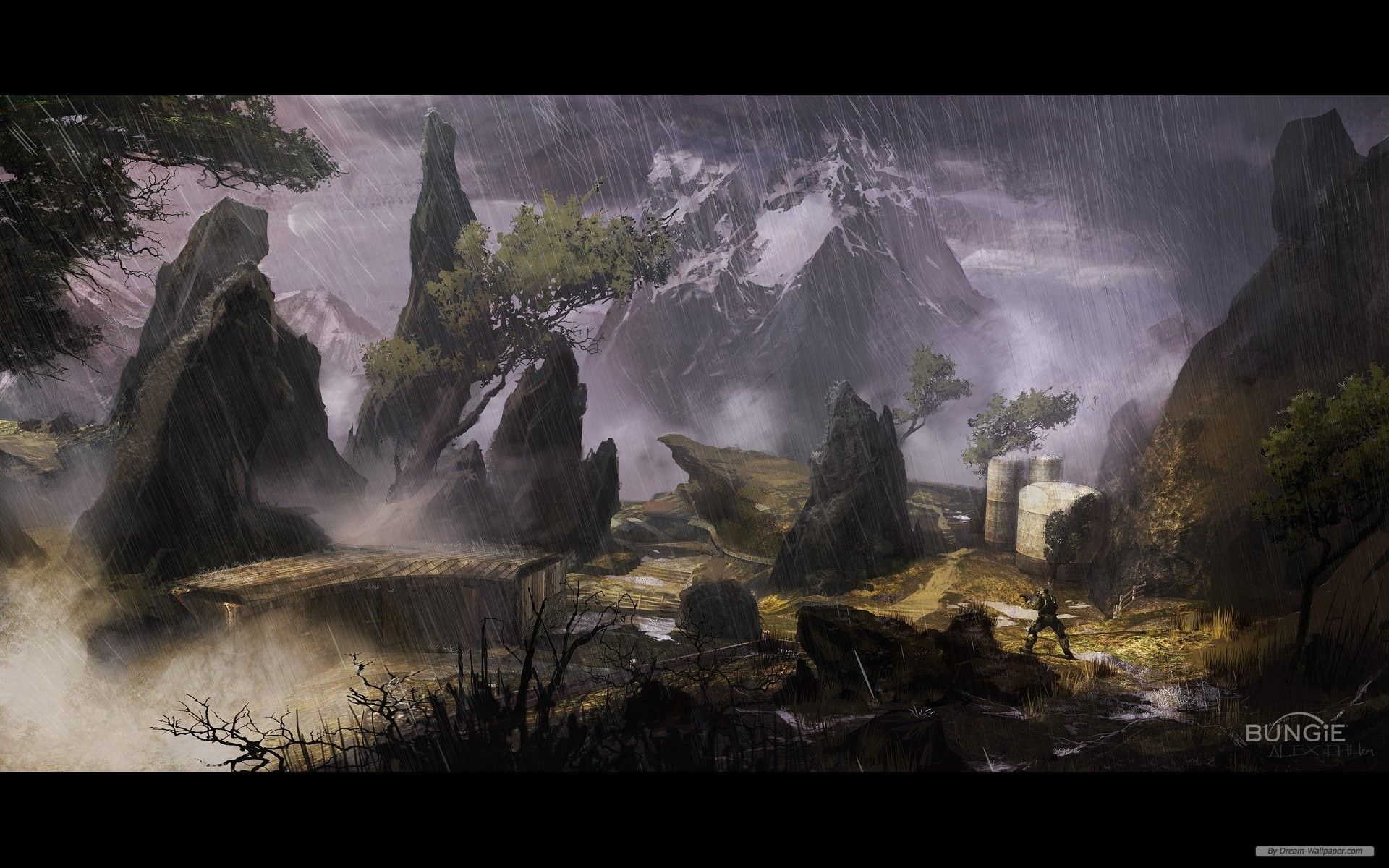 Description: A painting of a mountain scene with a man standing in the rain in the foreground and a mountain in the background.