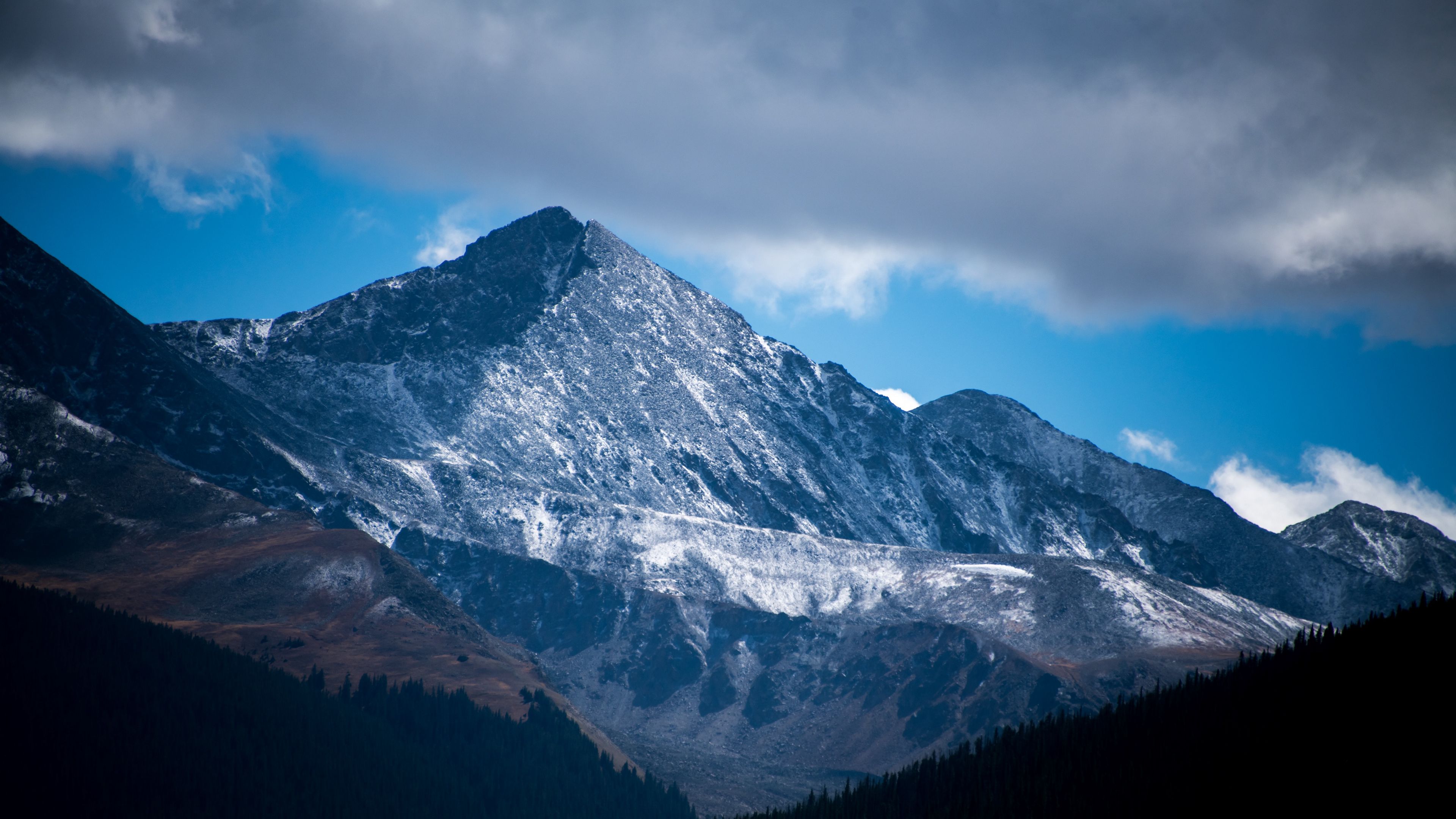 Description: A mountain with a snow covered peak in the distance with a forest below it and a blue sky with clouds.