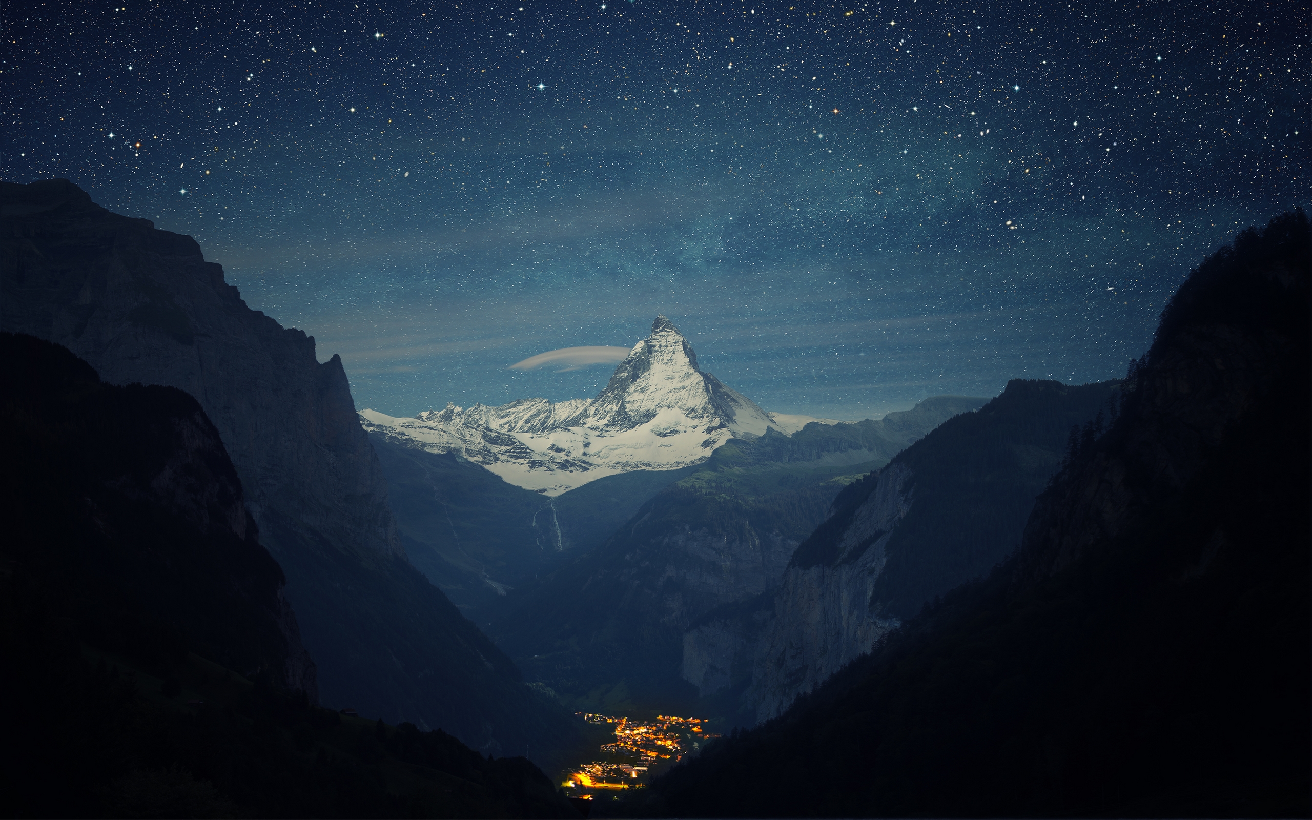 Description: A mountain with a snow covered peak in the distance and a city below it at night time with stars in the sky.