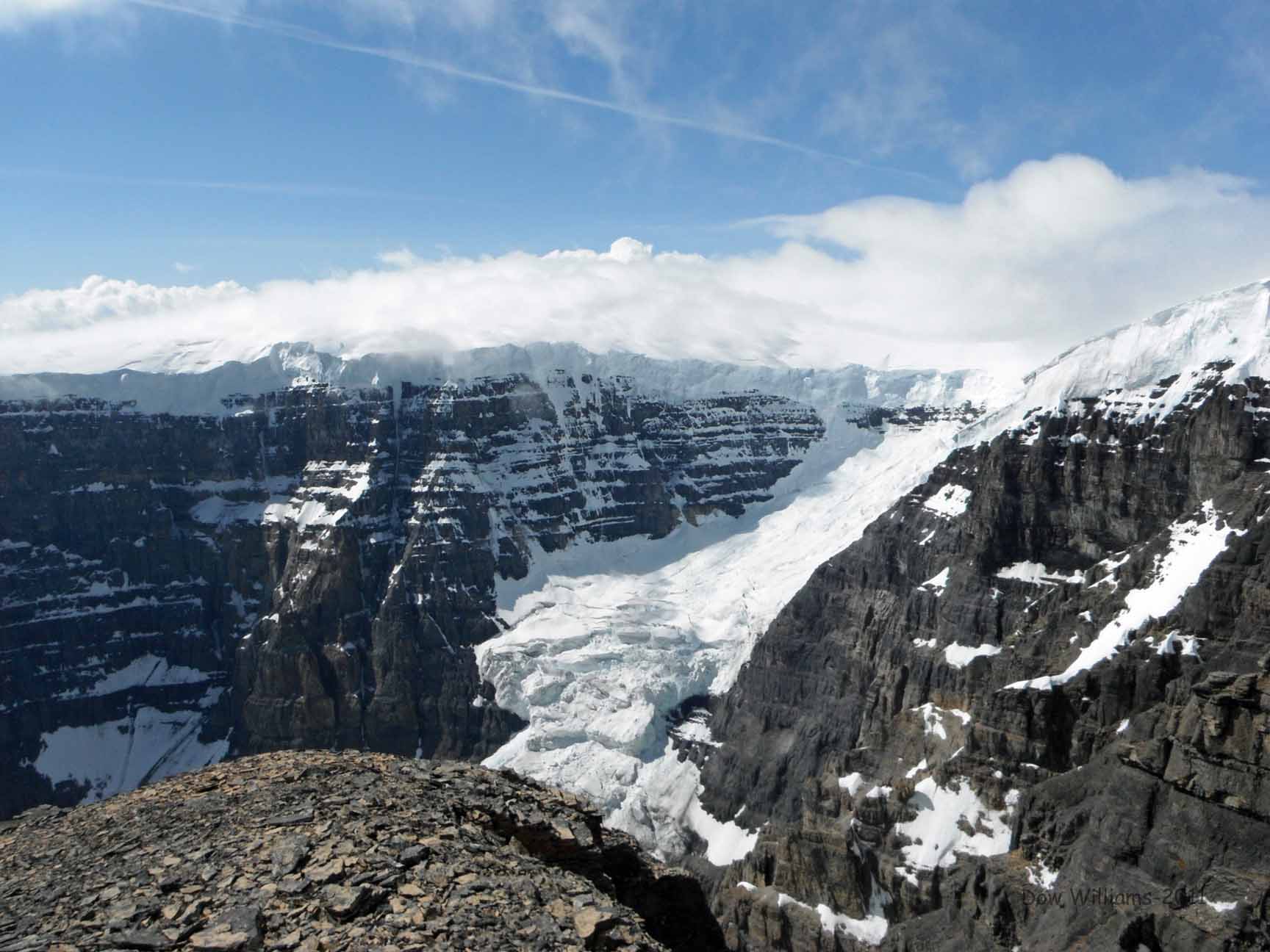 Description: A mountain with a snow covered mountain in the background and a blue sky with clouds above it and a person standing on a rock ledge.
