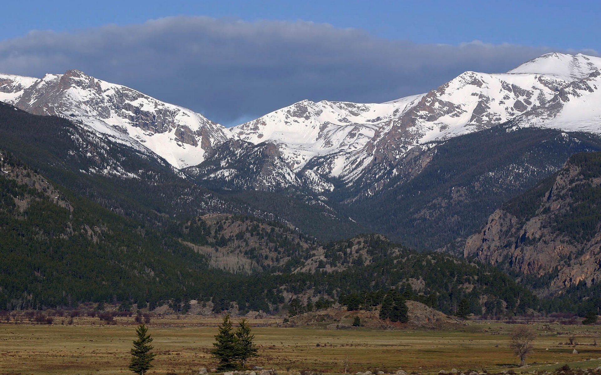 Description: A mountain range with snow on the top of it and a few trees in the foreground and a few cows in the foreground.