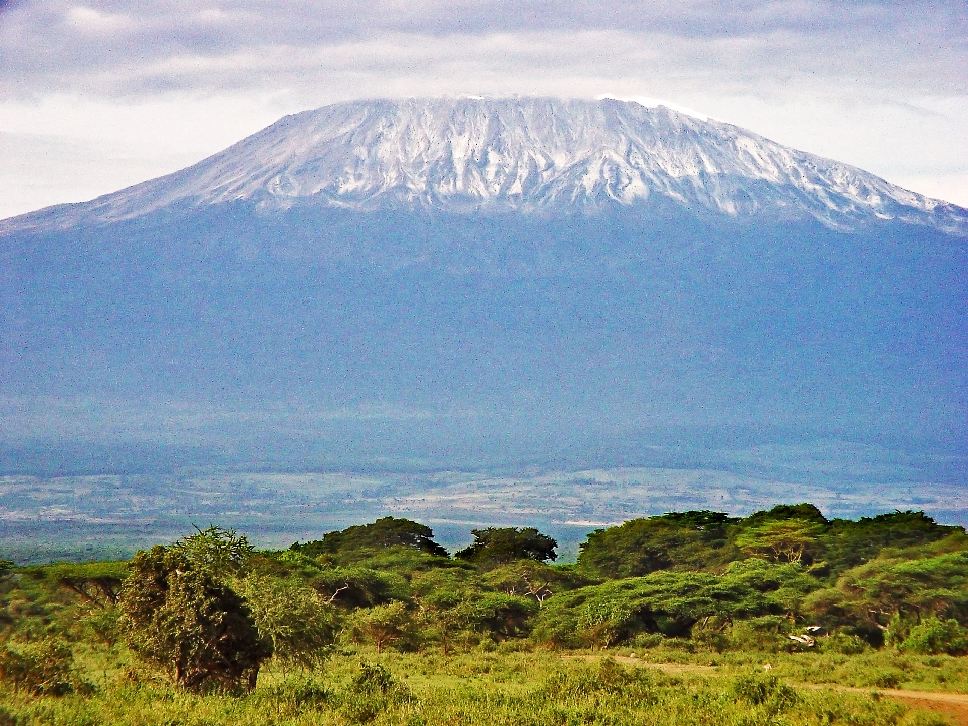 Description: A large mountain with a snow capped peak in the distance in the distance is a grassy field with trees and bushes.