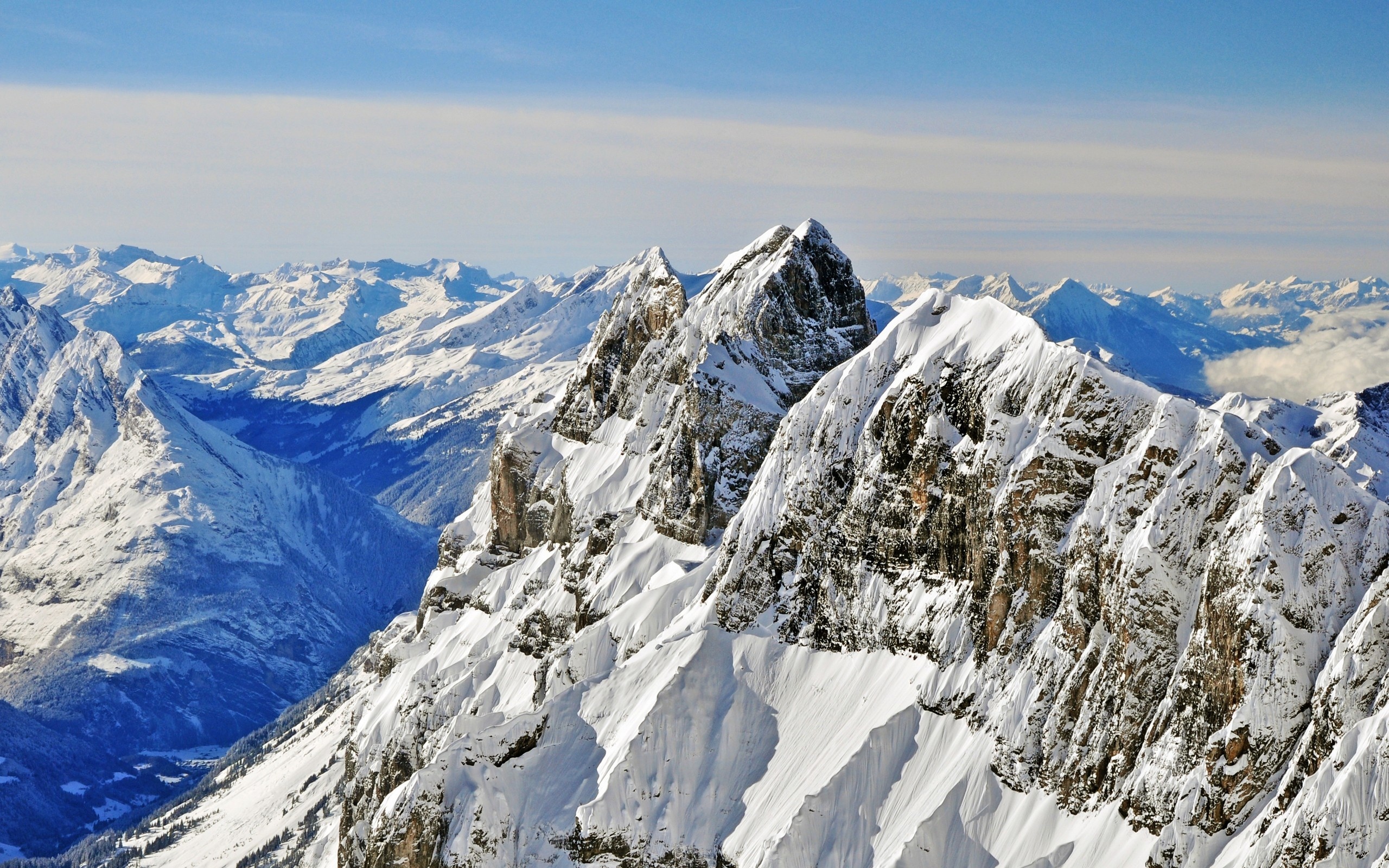 Description: A mountain range covered in snow under a blue sky with clouds in the background and a few clouds in the sky.