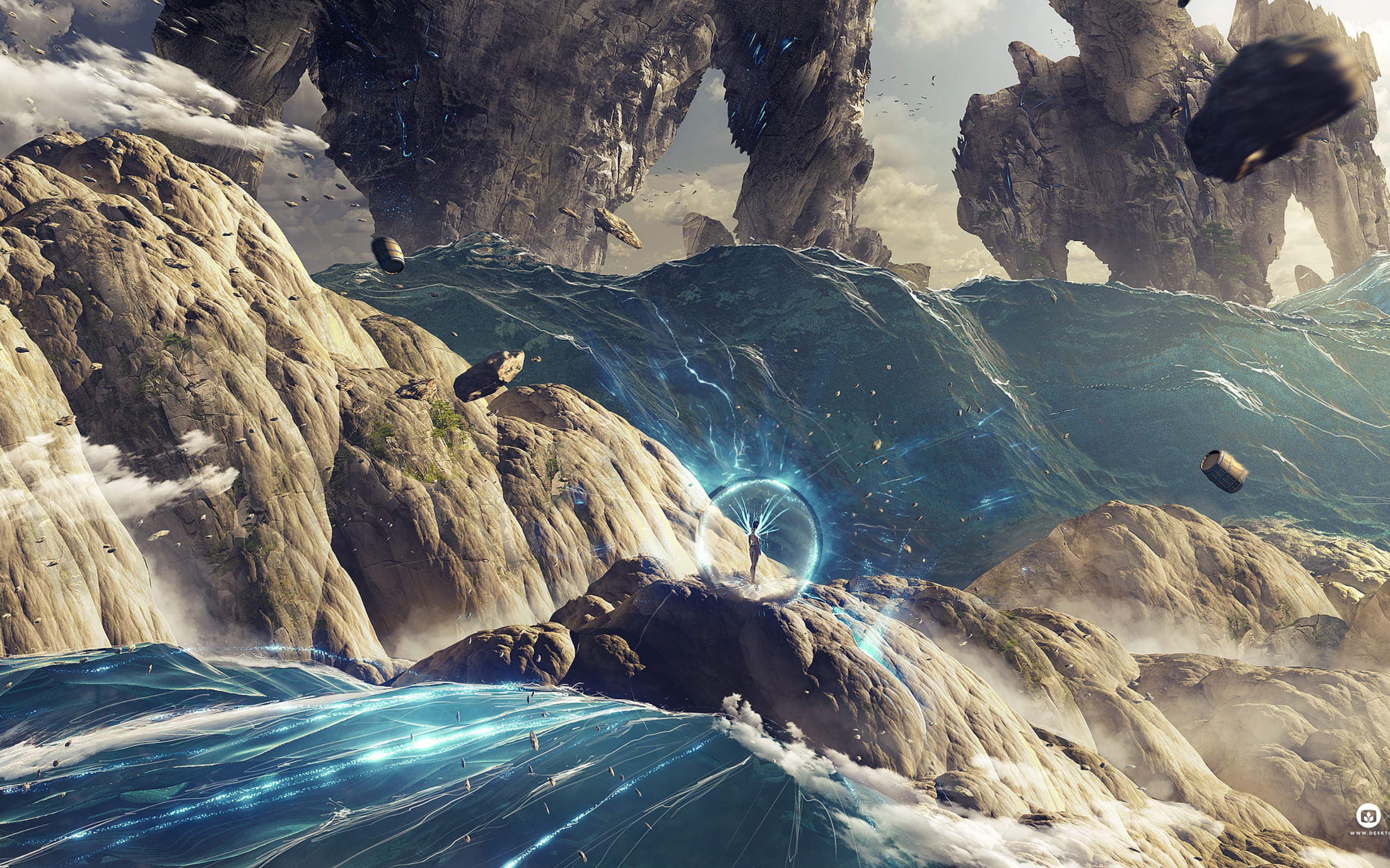 Description: A computer generated image of a mountain stream with birds flying over it and a waterfall in the background with rocks and water.