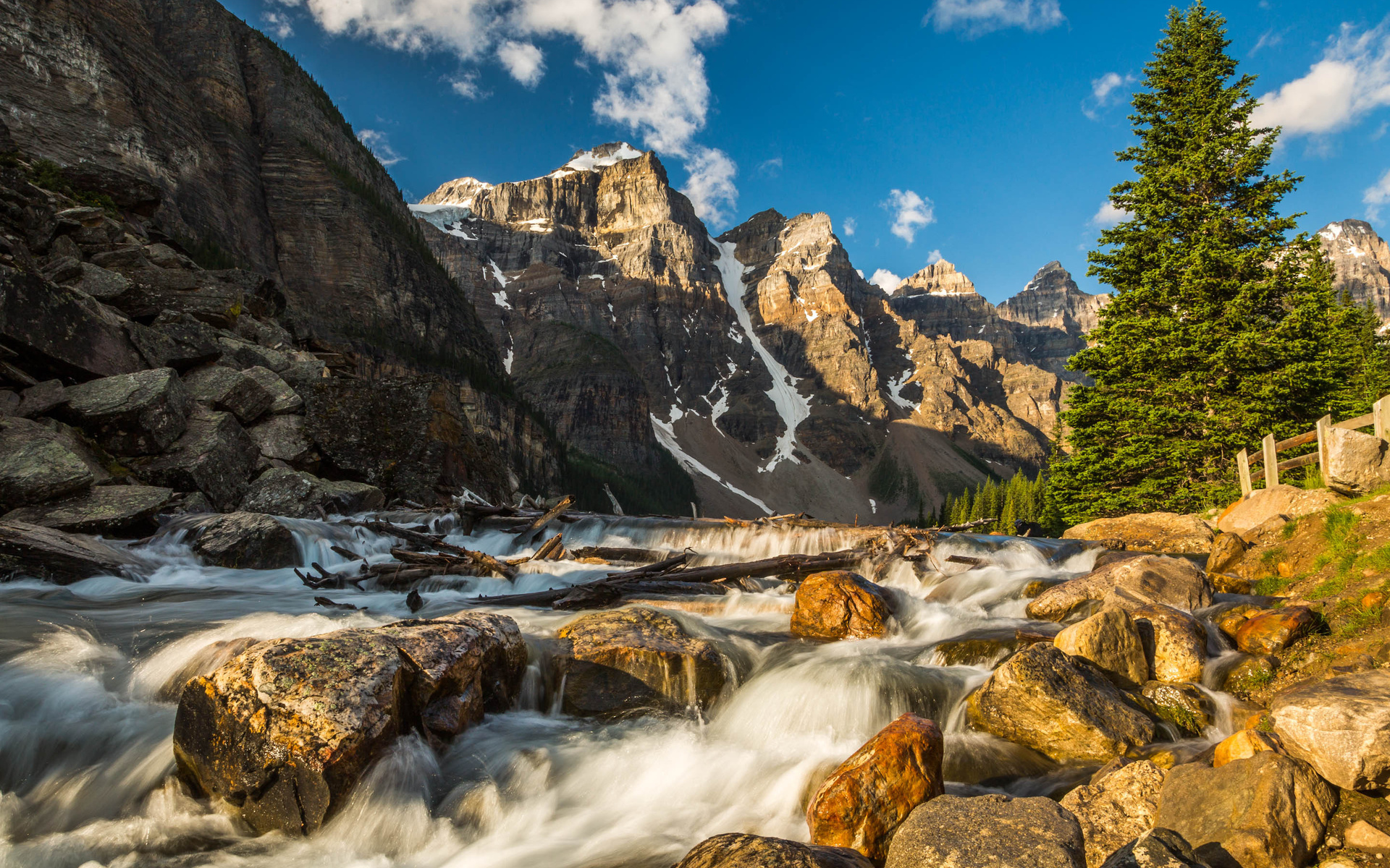 Description: A mountain stream with rocks and trees in the foreground and a mountain range in the background with snow on the top.