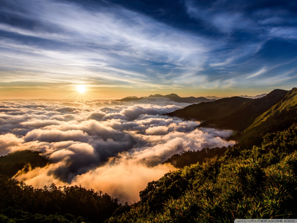 Description: A view of a mountain with a sun in the distance and clouds below it and a few trees on the side.