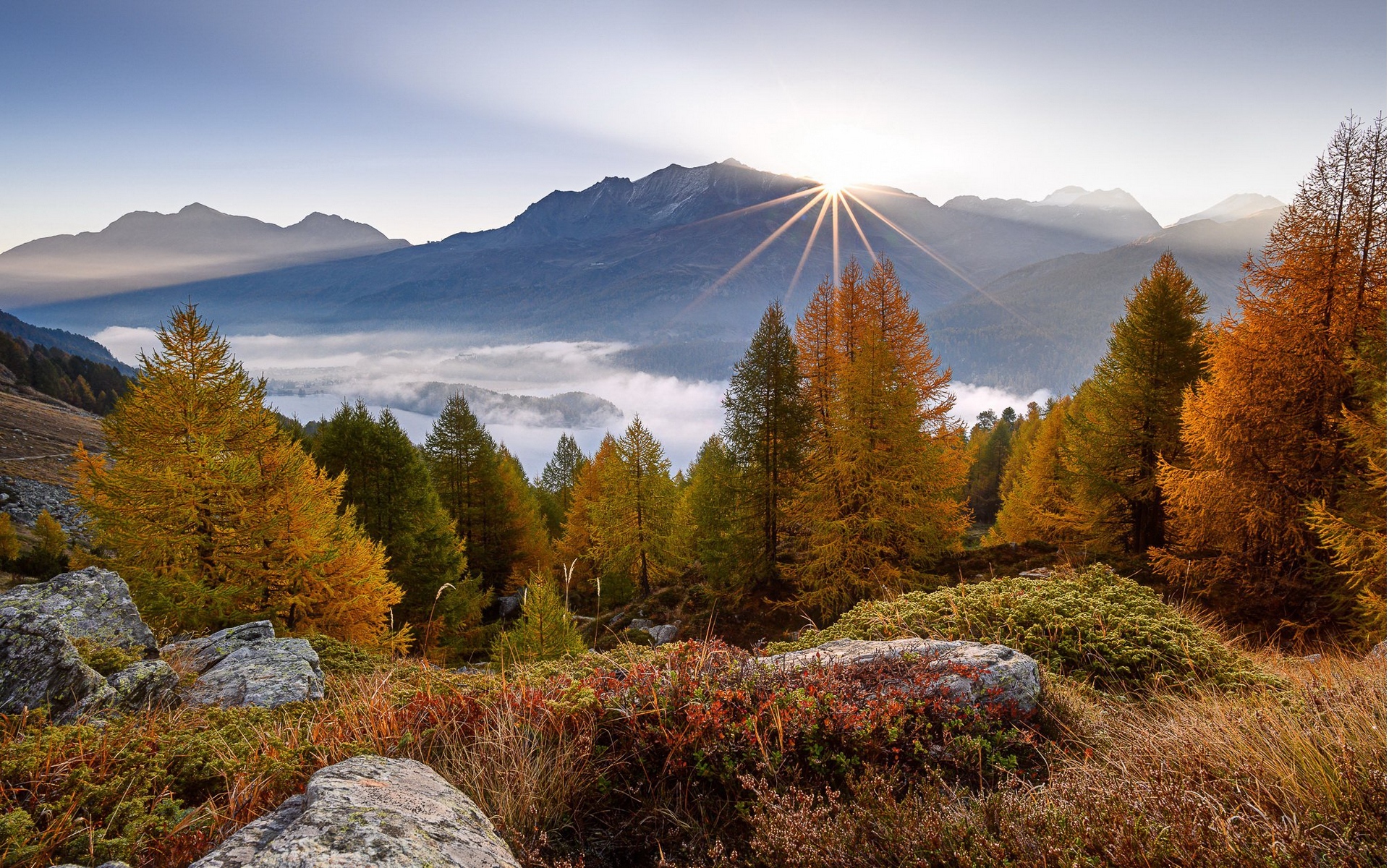 Description: A mountain range with a sunburst in the sky above the trees and rocks and grass below it.