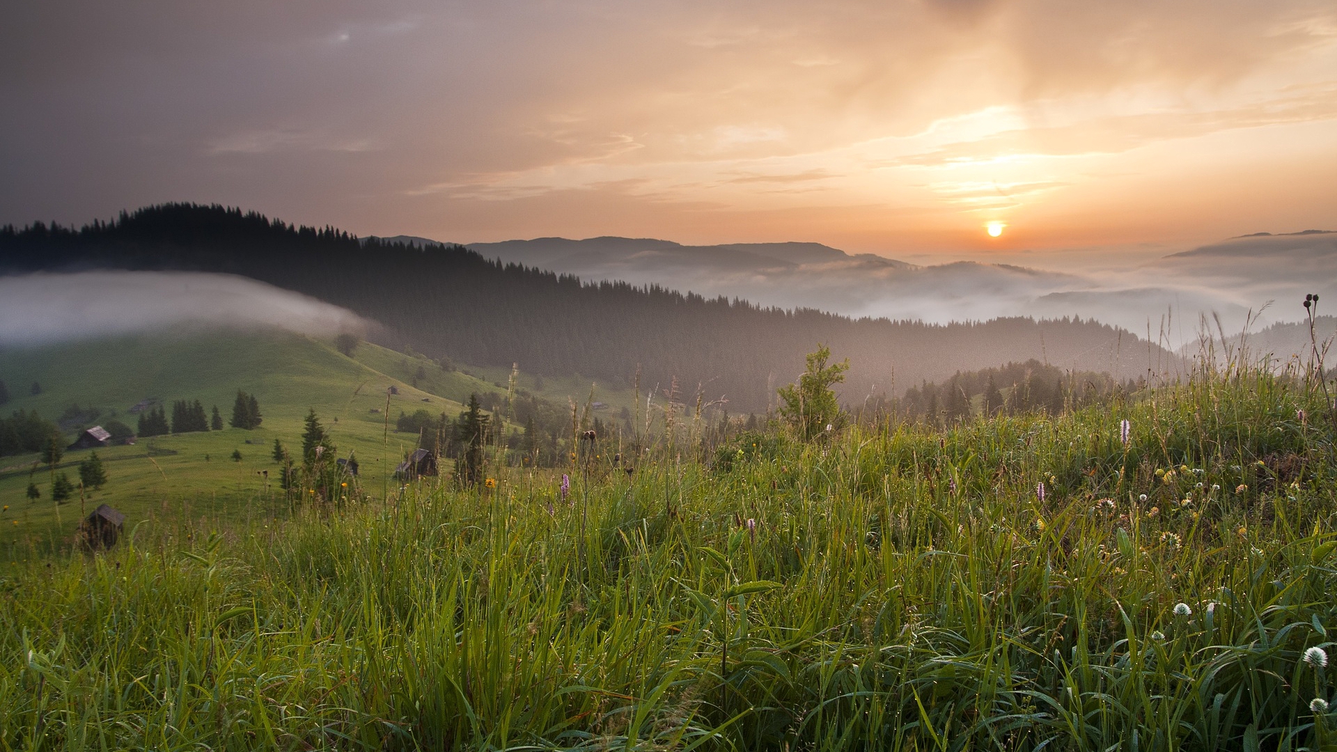 Description: A field with a mountain in the background and a sun setting in the distance with clouds in the sky.