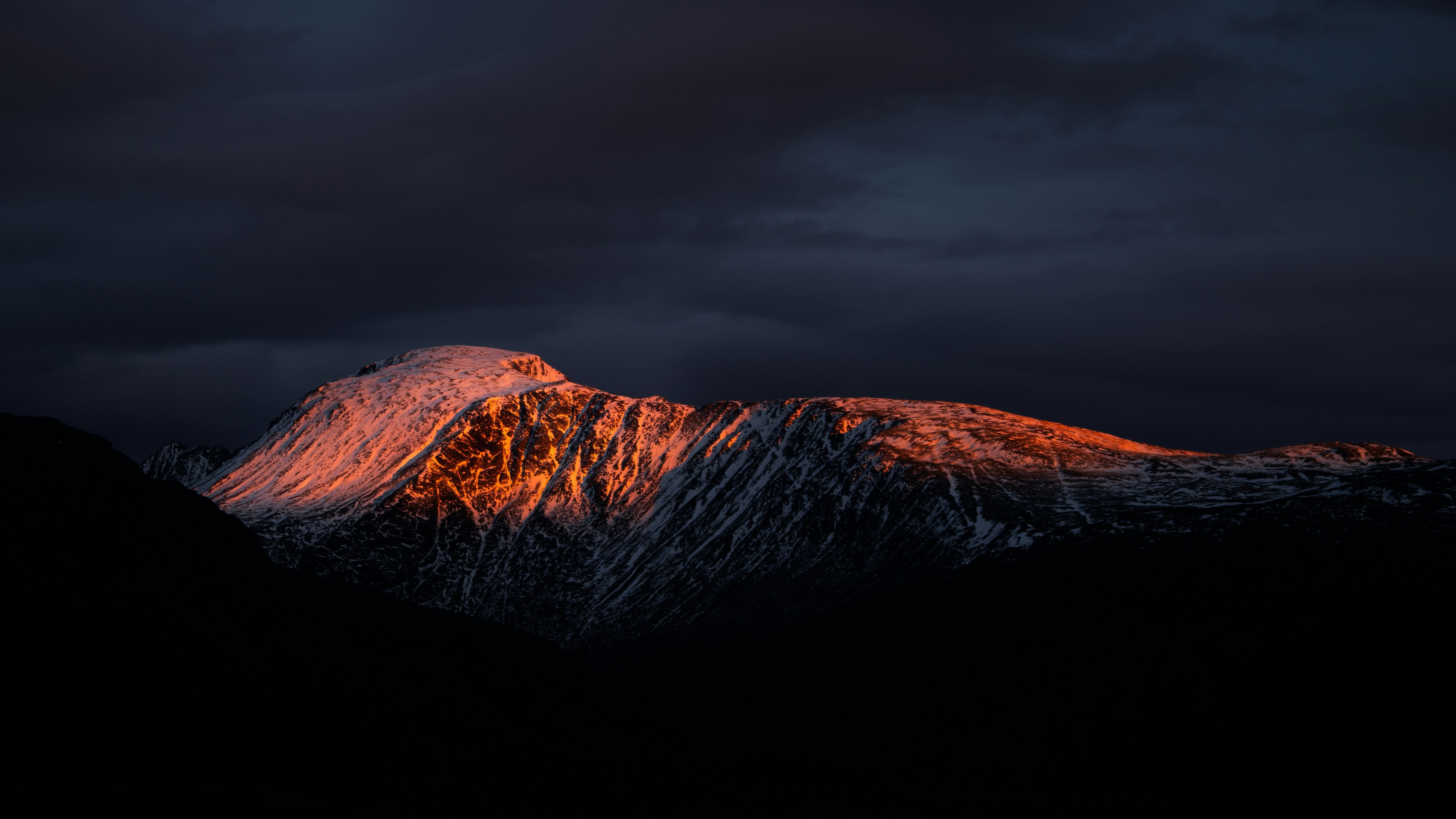 Description: A mountain with a very tall peak under a cloudy sky with a light on it's side and a few clouds above it.
