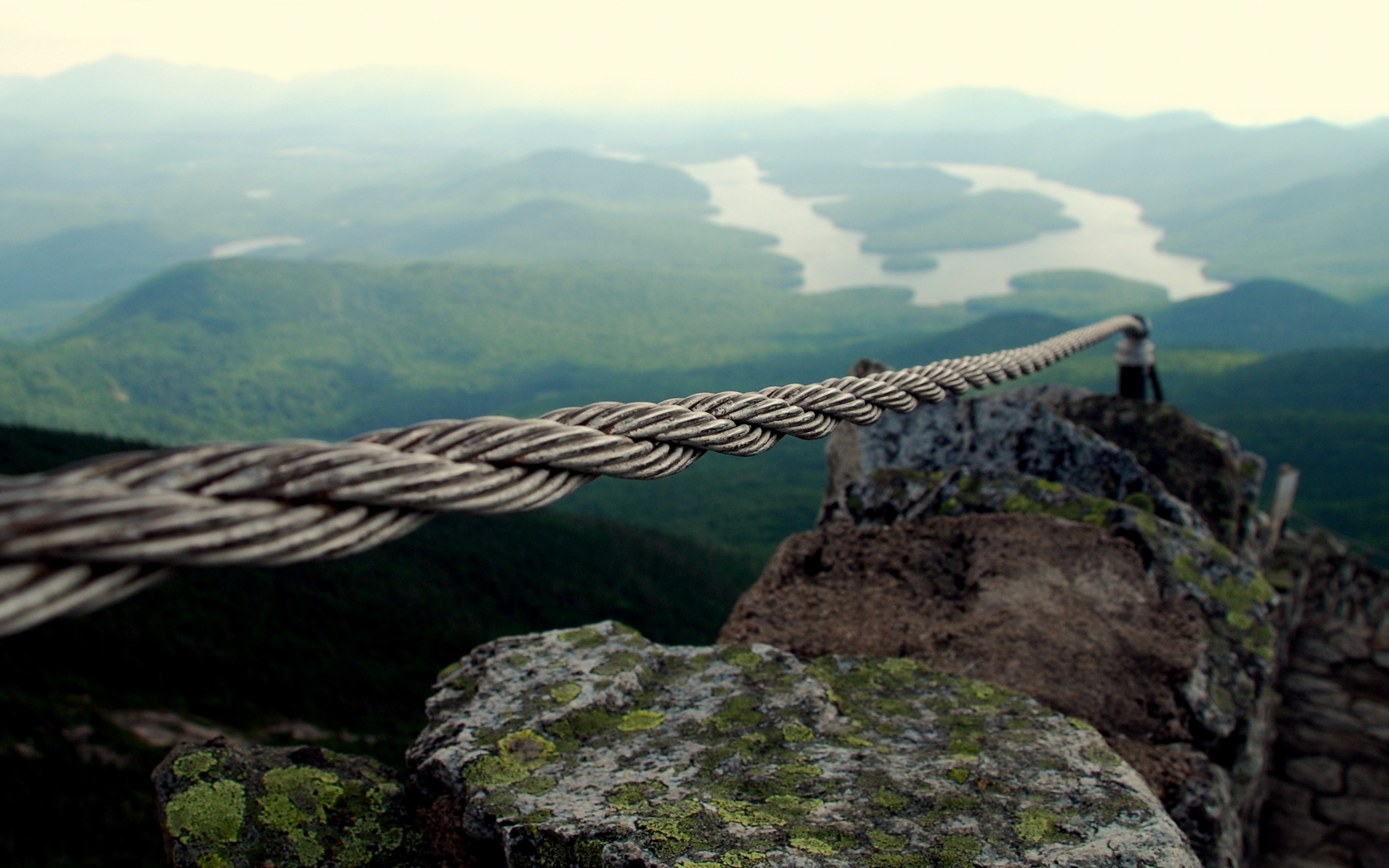 Description: A rope is attached to a rock on a mountain top with a view of a valley and a lake.