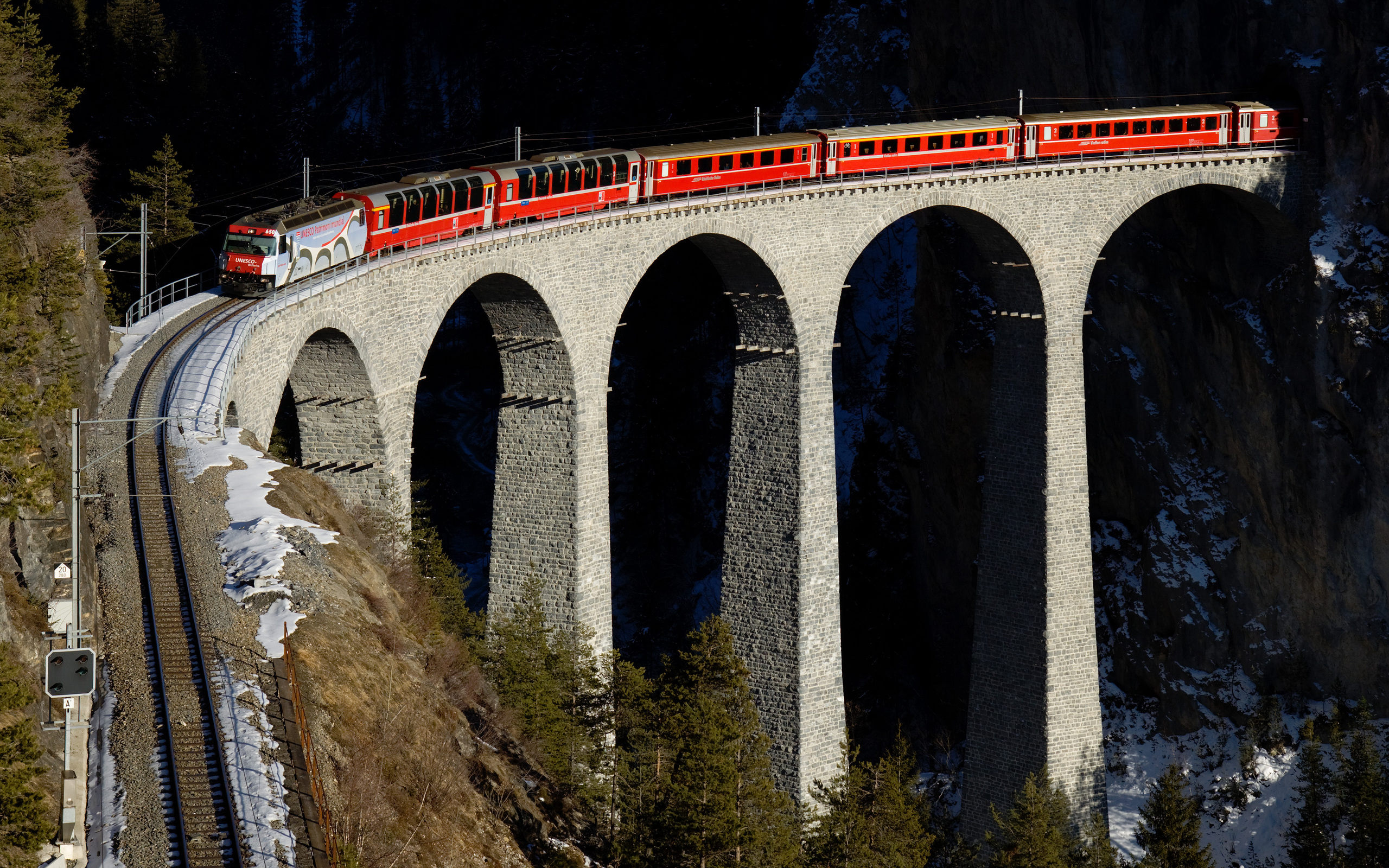 Description: A train is traveling over a bridge in the mountainside area of a city.