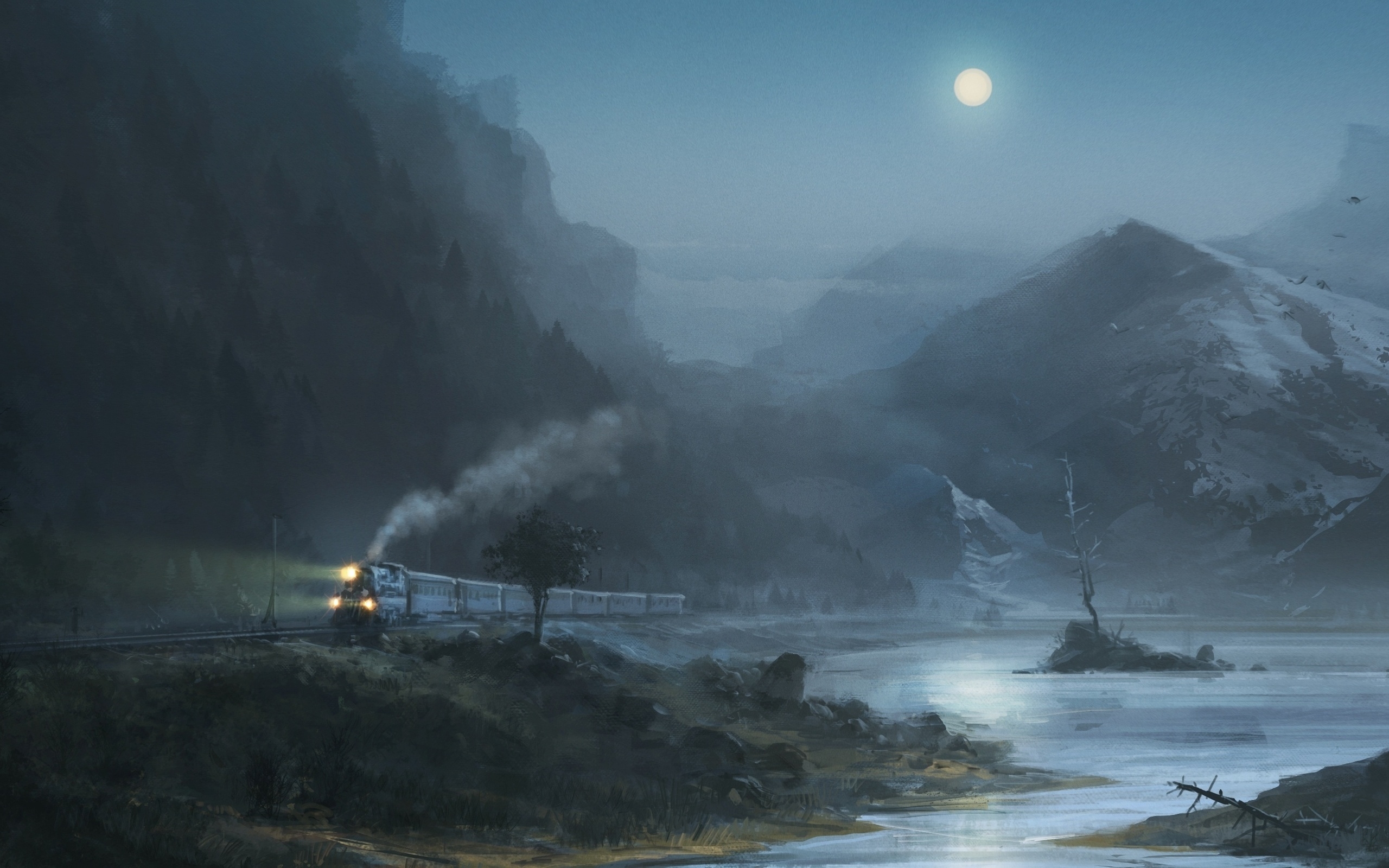 Description: A train traveling through a mountainous countryside under a full moon sky with a river running through it and a mountain range in the background.