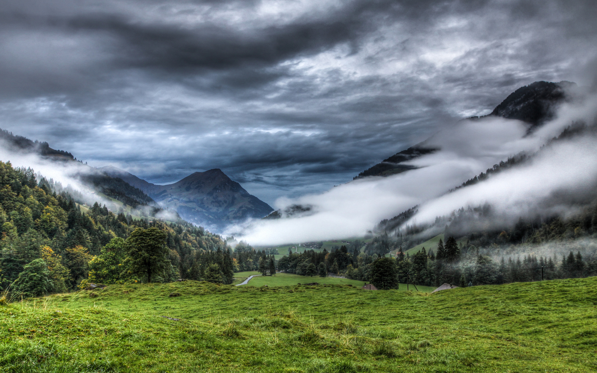 Description: A mountain valley with a grassy field and a forest in the background with clouds in the sky and a few trees in the foreground.