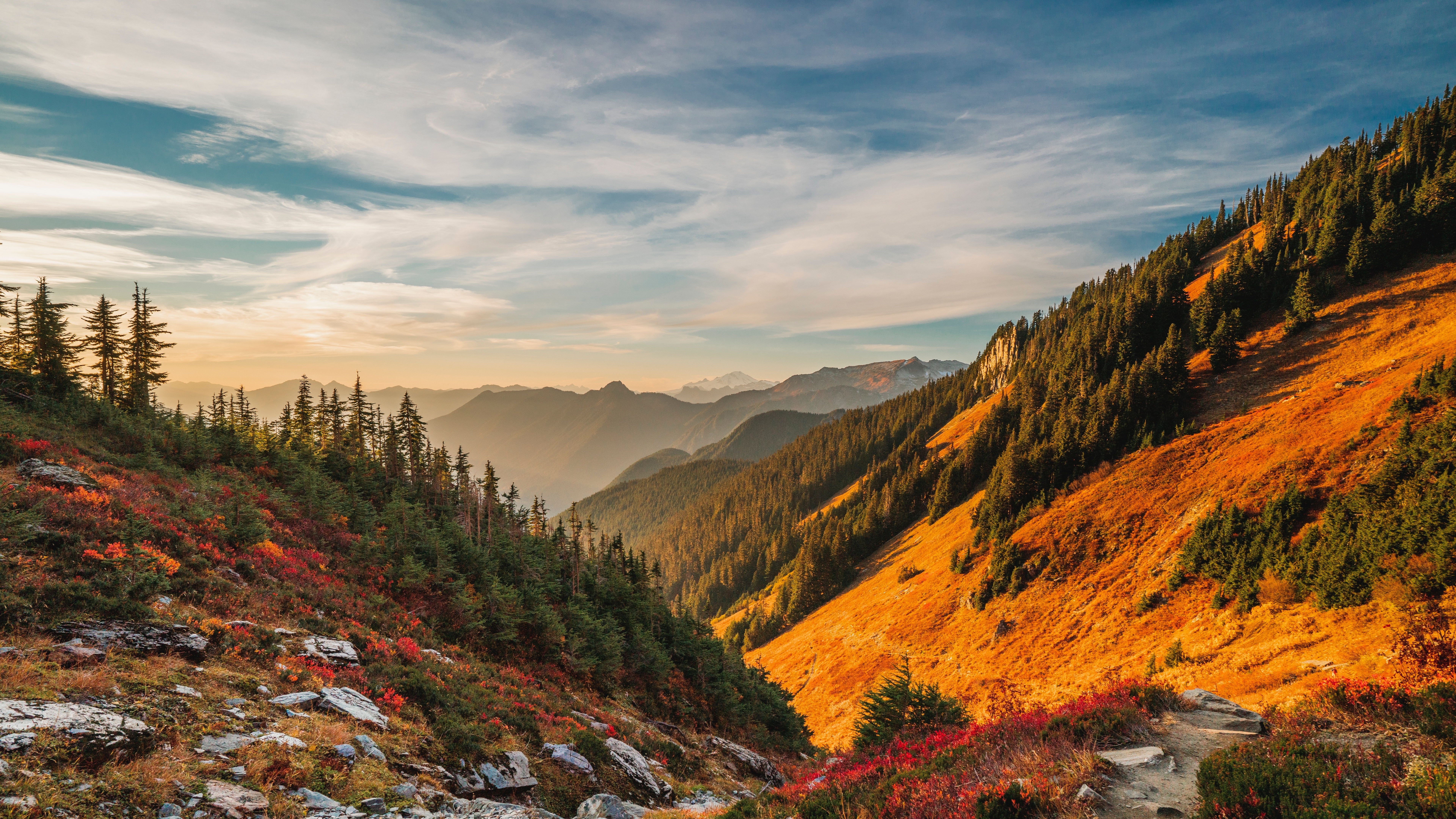 Description: A mountain with a valley and trees on it at sunset or sunrise with clouds in the sky and sun shining on the mountains.