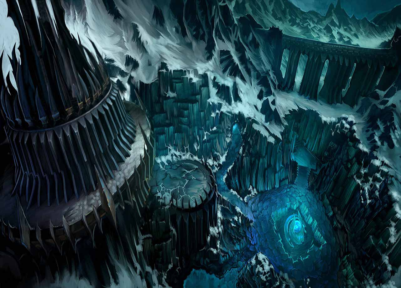 Description: A painting of a mountain with a pool of water in it and a giant structure in the middle of the picture.