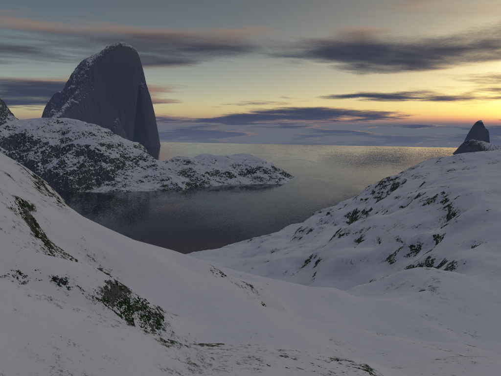 Description: A mountain with a body of water in the distance and a mountain with a rock formation in the foreground.