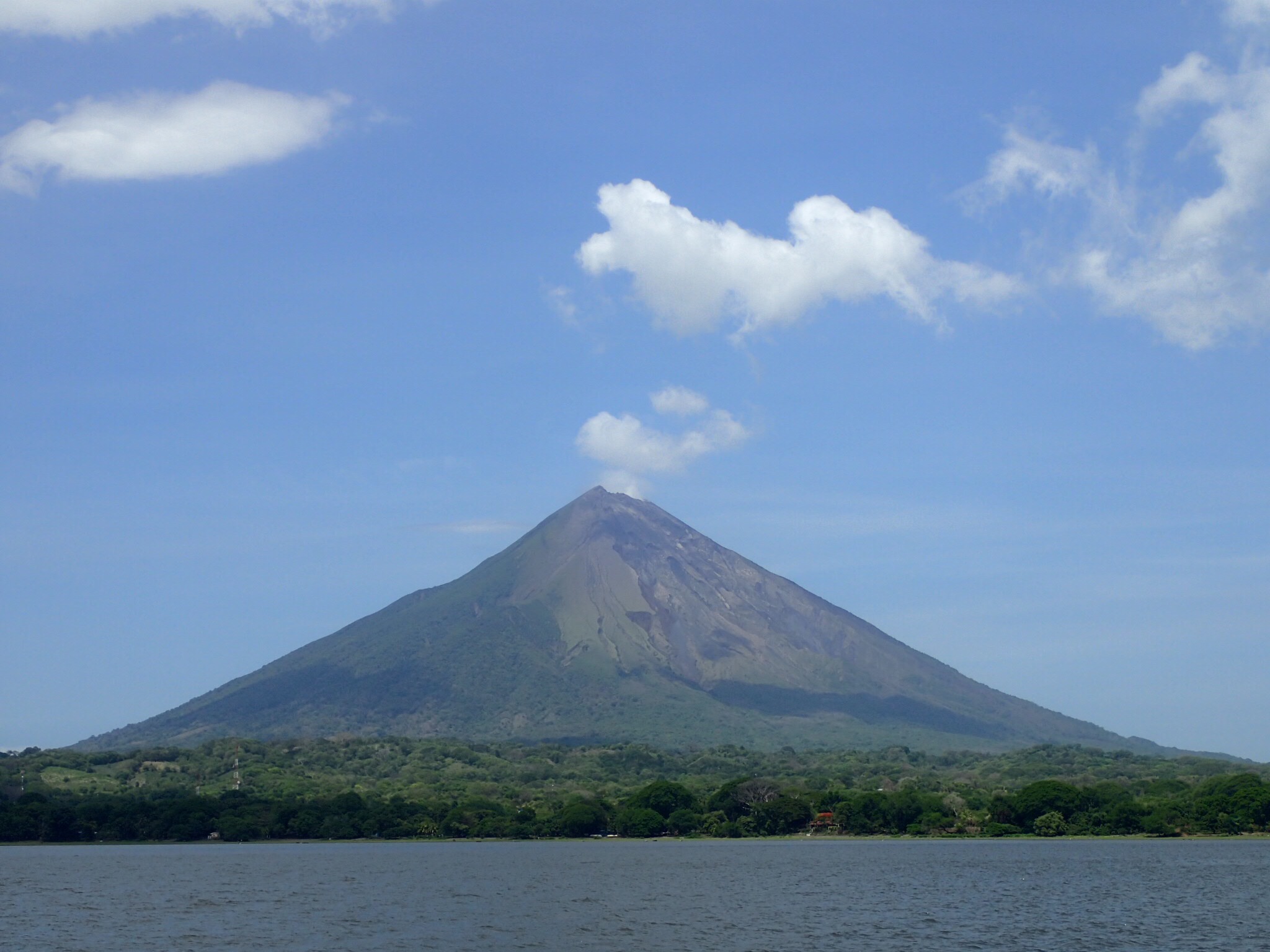 Description: A large mountain rising above a body of water with trees on the shore and a boat in the water.