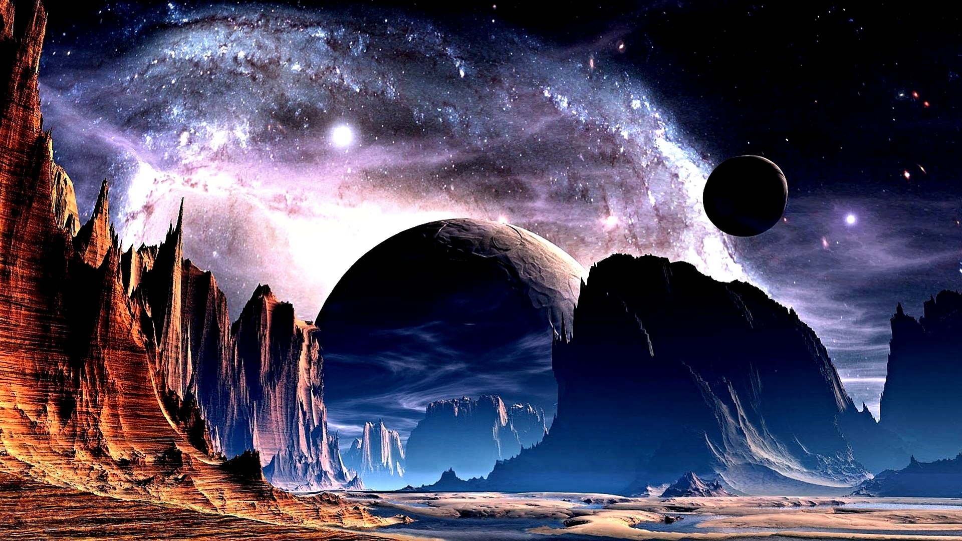 Description: A group of mountains and planets in a space scene with stars and a distant star cluster in the background.