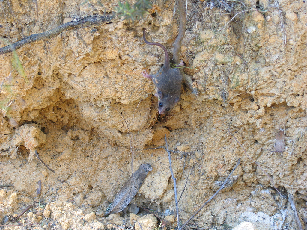 Description: A mouse climbing up a rock wall with a tree in the background and a dead rat in the foreground.