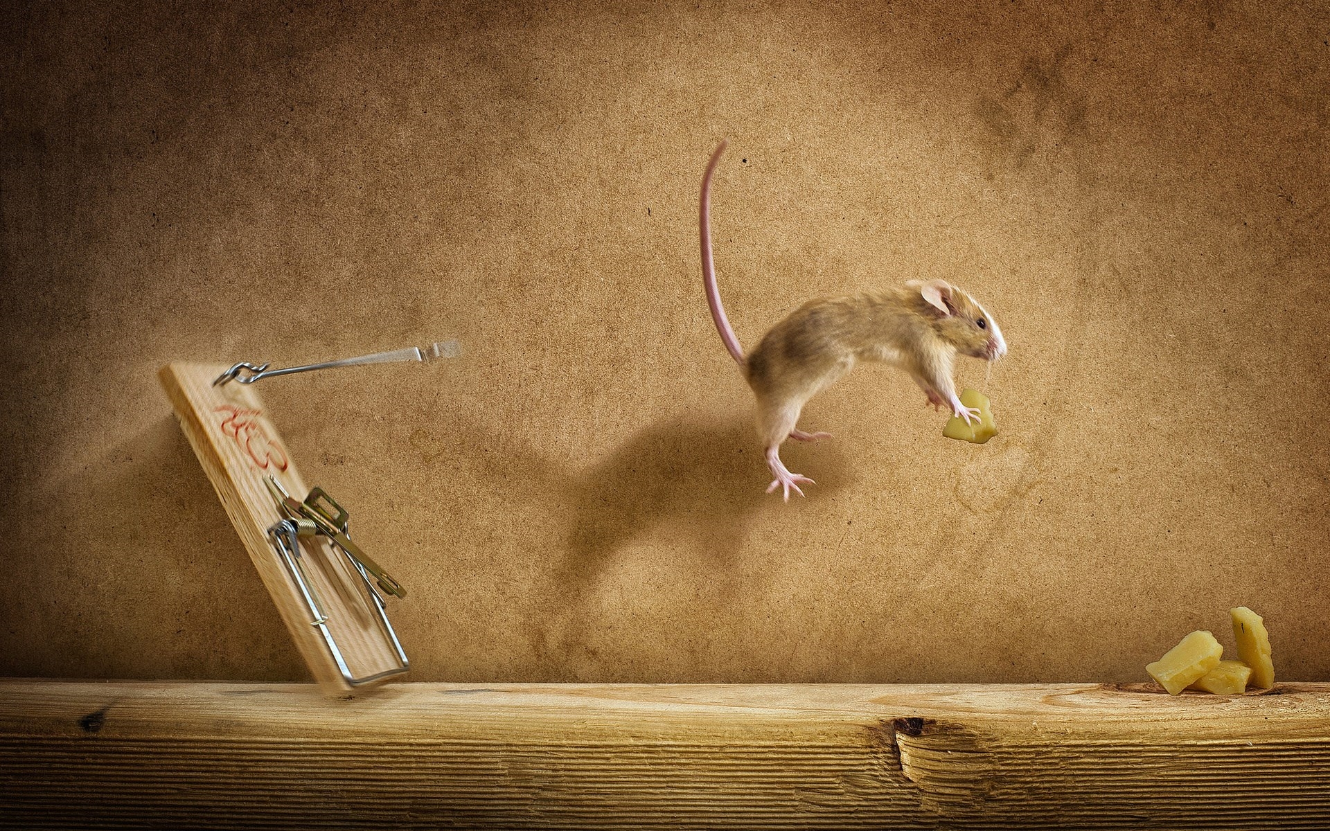 Description: A mouse is eating a piece of fruit on a table next to a mousetrap and a mouse.