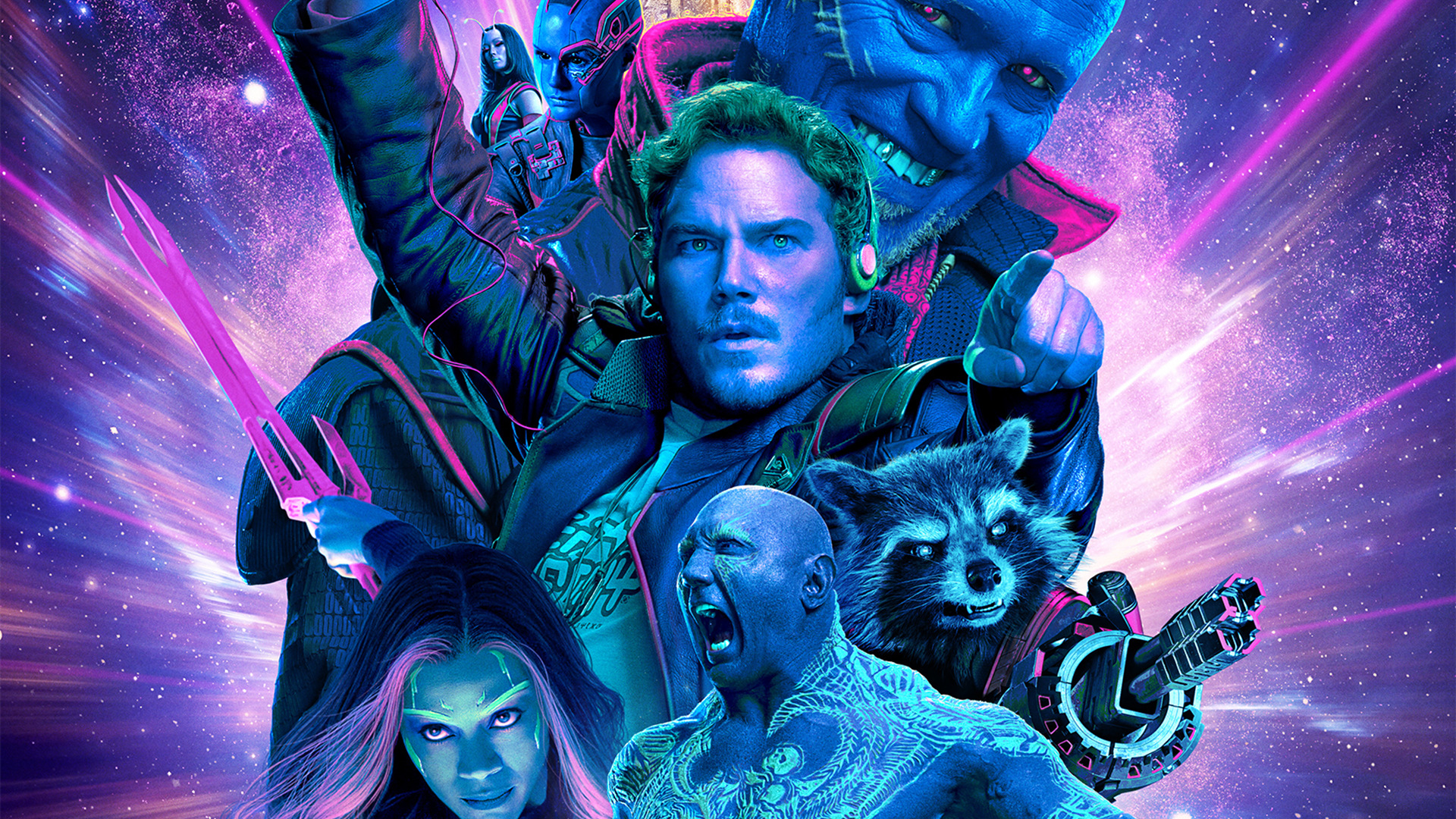 Description: A movie poster with a man surrounded by other characters and a rocket ship in the background with a galaxy background.