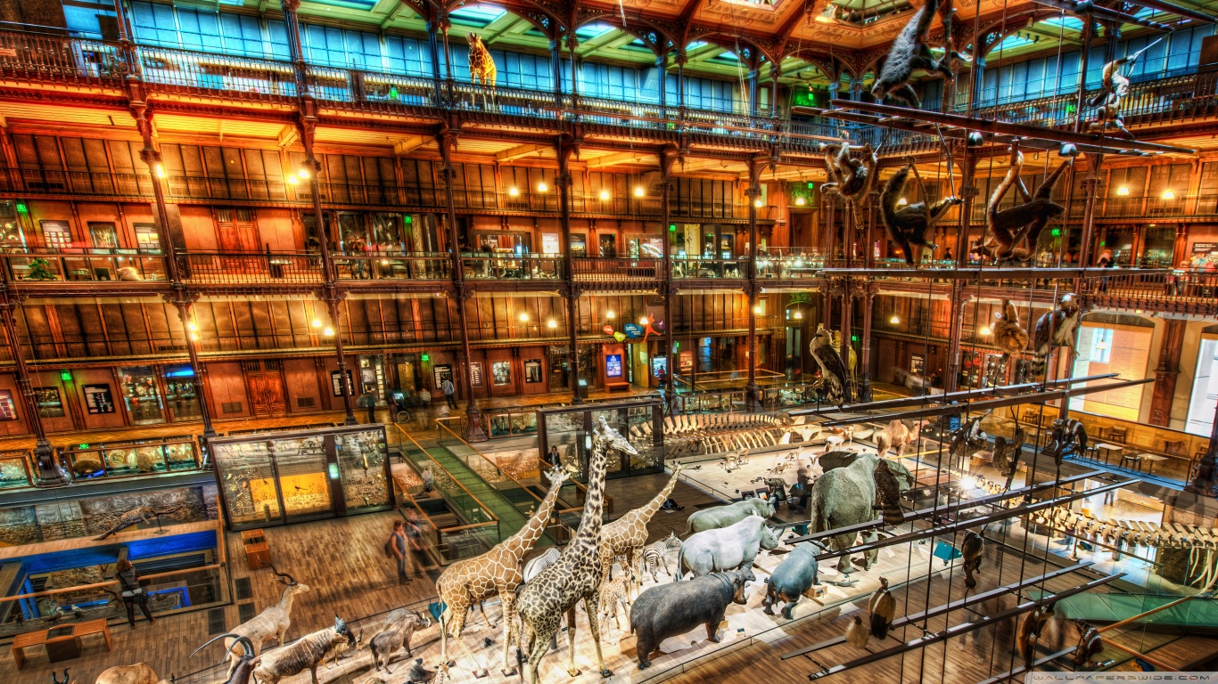 Description: A museum filled with animals and people looking at them in a museum like setting with a large glass ceiling.