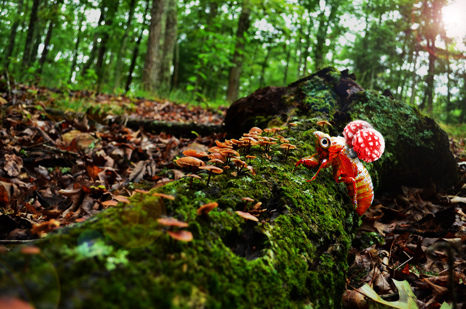 Description: A mushroom is sitting on a mossy log in the woods with sun shining through the trees behind it.