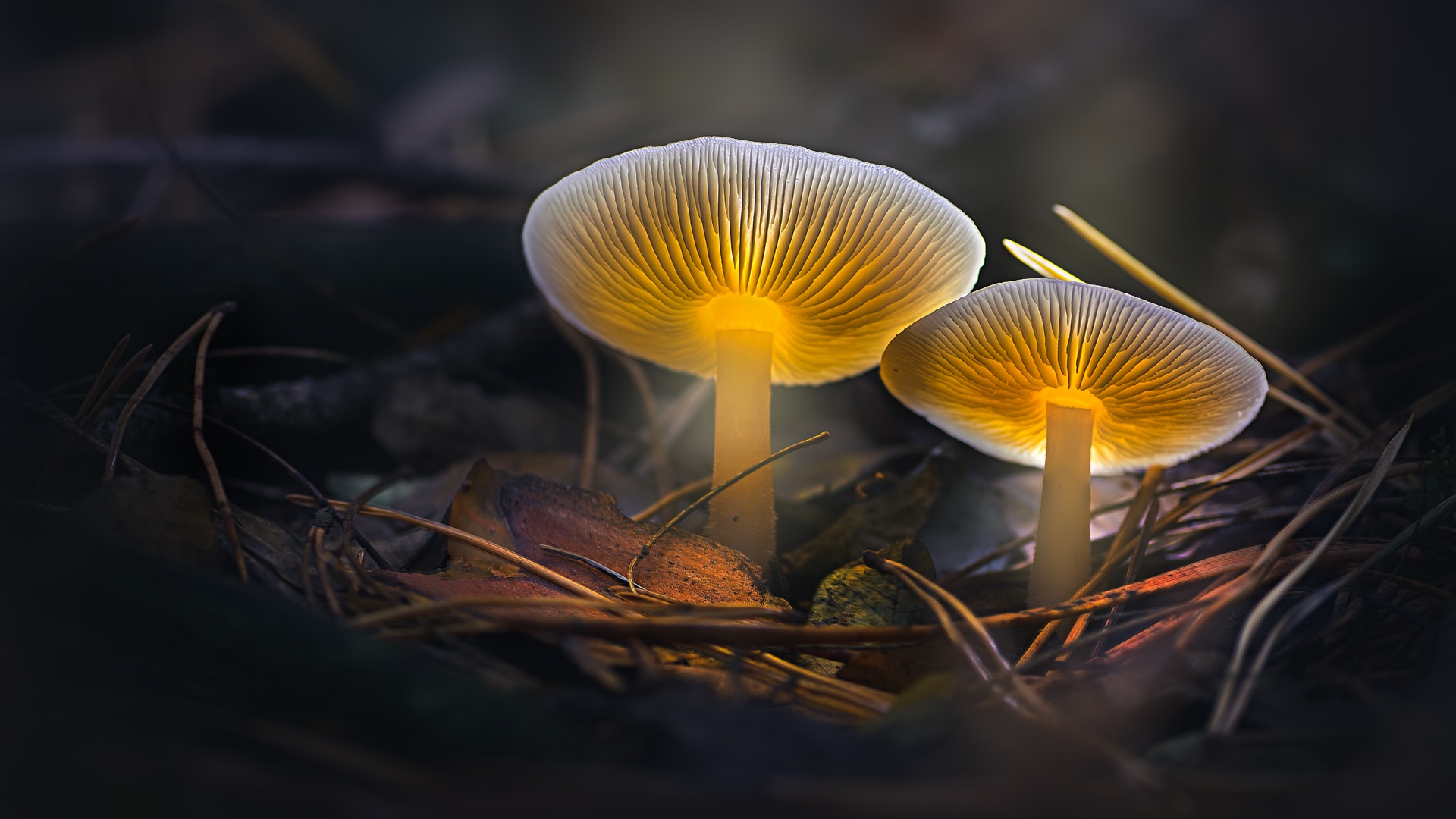 Description: Two mushrooms are sitting on the ground in the woods together.