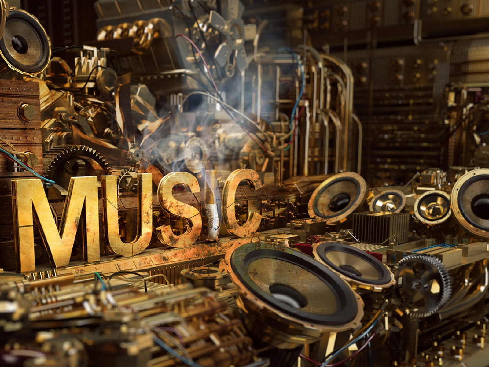 Description: A large number of musical instruments and speakers in a room with a sign that says music on it and steam rising from the top.