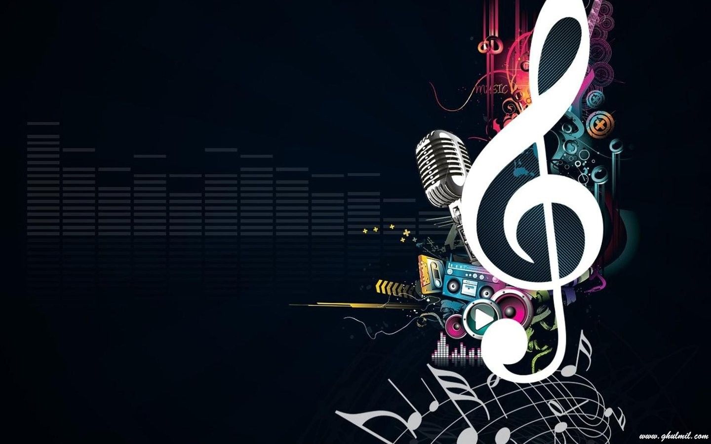 Description: A musical note with musical symbols on it and a microphone in the background with a black background with a white treble.