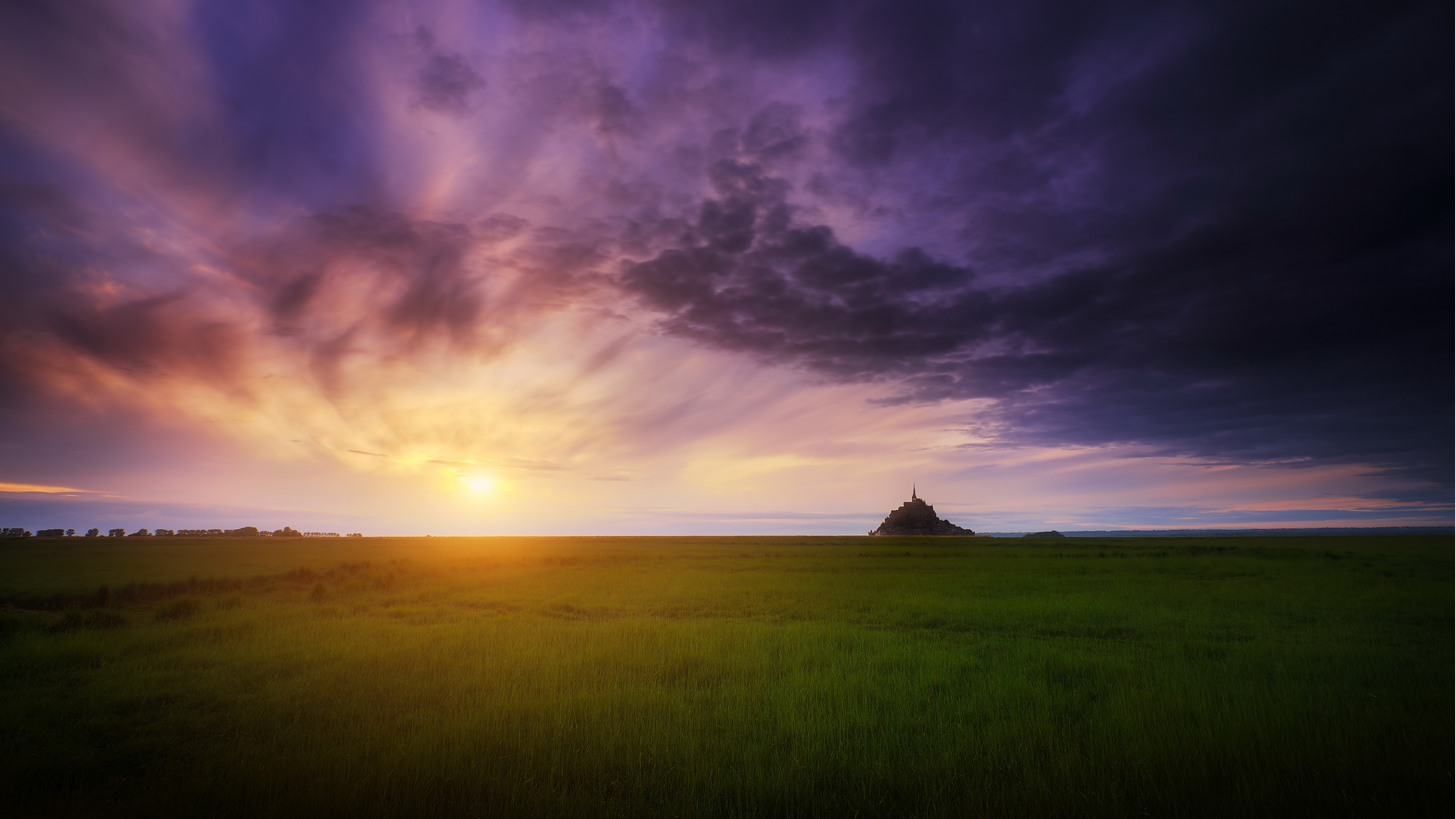 Description: A field with a small house in the distance under a cloudy sky at sunset with the sun setting behind the clouds.