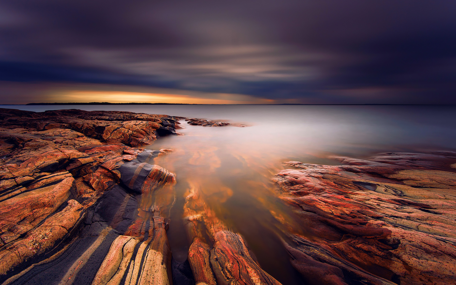 Description: A rocky shore with a body of water and a cloudy sky above it at night time with a long exposure of light.