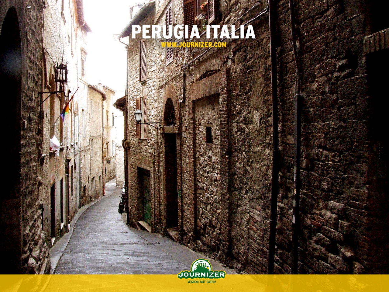 Description: A narrow alley way with a cobblestone street and buildings in the background with a yellow border around the image.