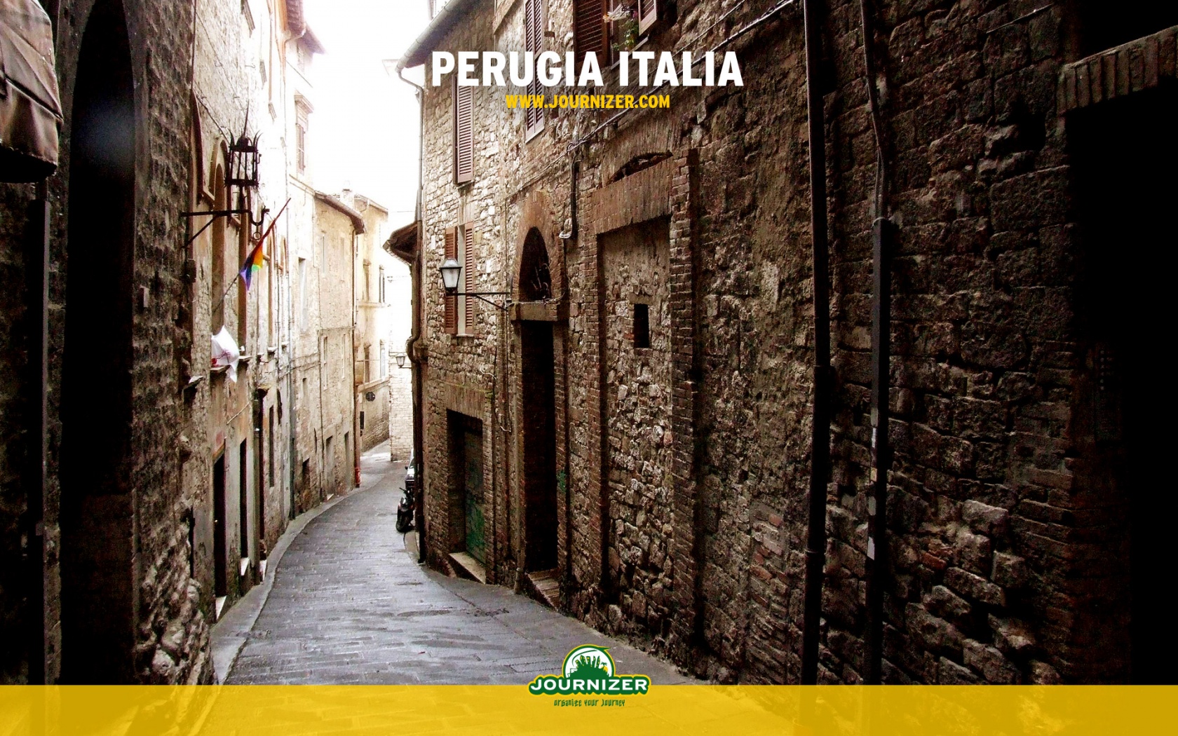 Description: A narrow alley way with a yellow sign that says perigia italia on it's side and a yellow sign that says perigia italia on the side.