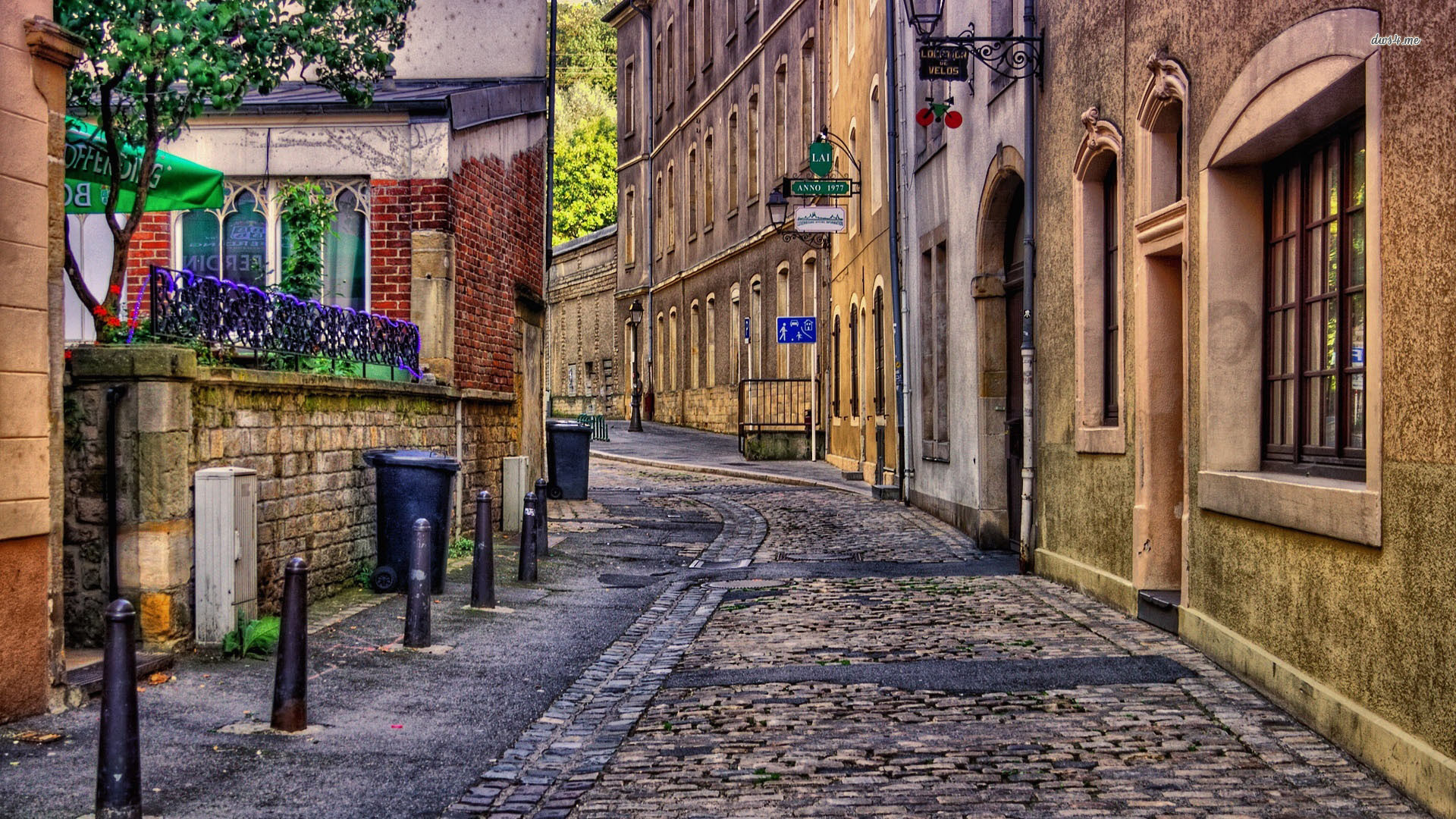 Description: A narrow street with a brick sidewalk and a building with a balcony on the top of it and a green flag on the top of the building.
