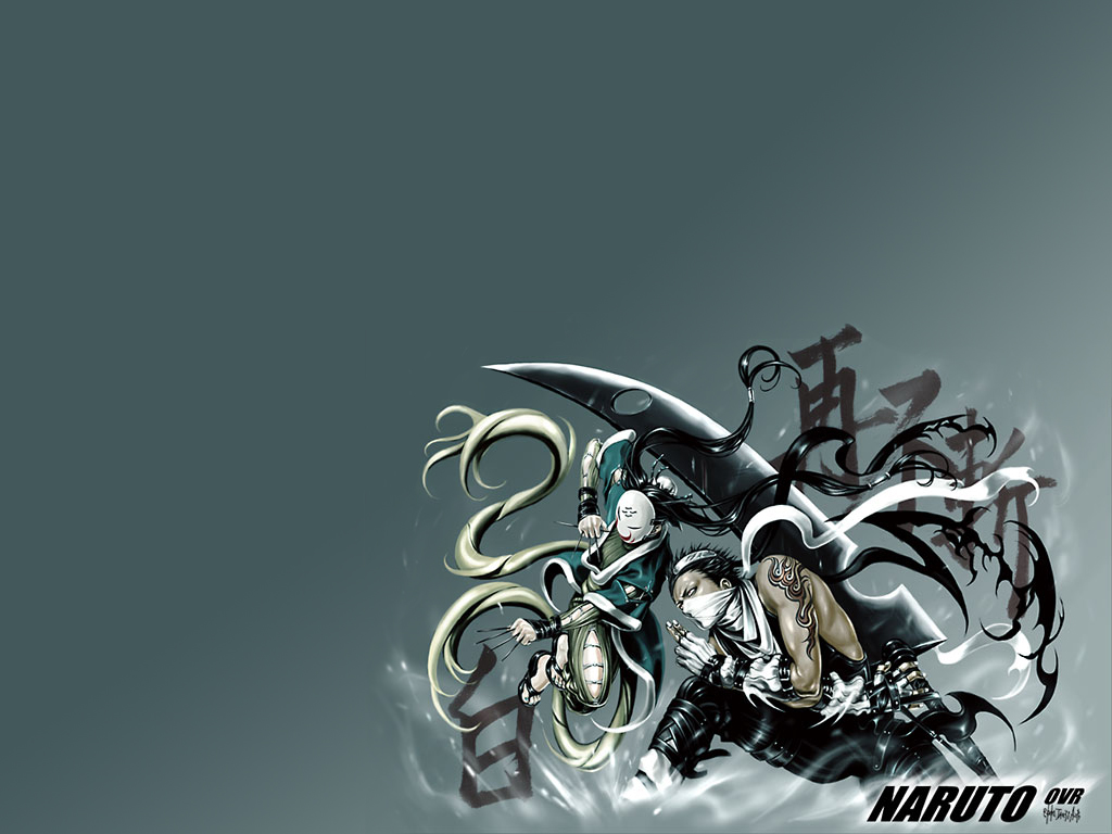 Description: A couple of anime characters with a sword and a demon on a gray background with the word naruto written in japanese.