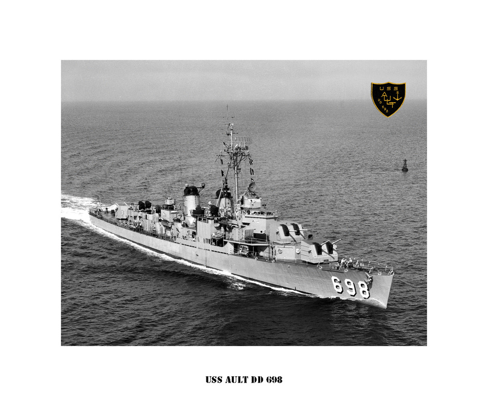 Description: A navy ship in the middle of the ocean with a shield on it's side and a black and white photo of the ship.