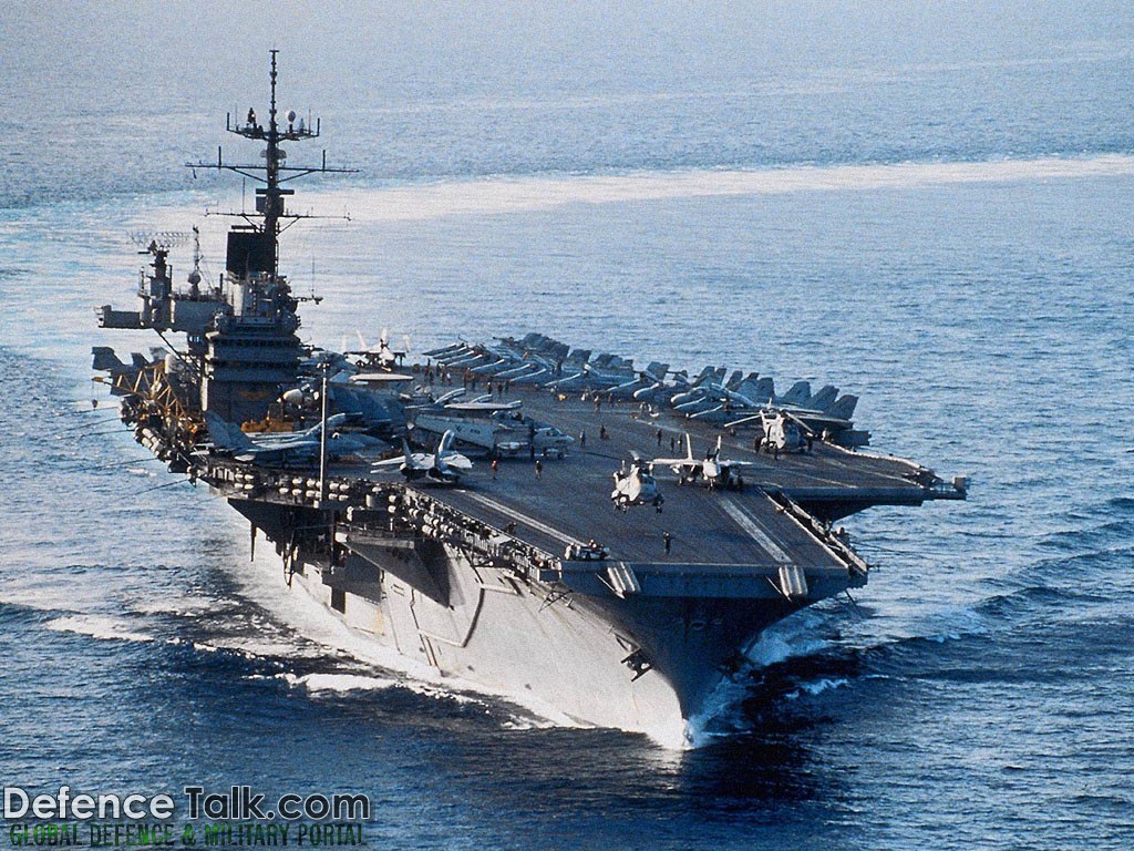 Description: A large navy ship sailing across the ocean with lots of smaller ships on it's deck and a smaller one in the water.