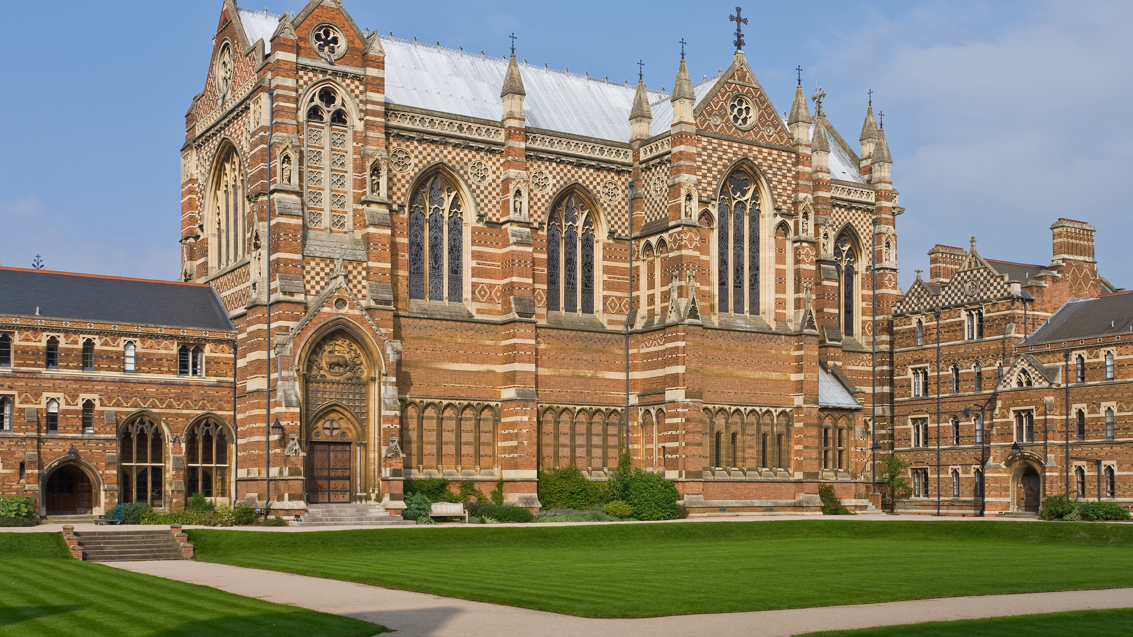 Description: A large building with a lawn in front of it and a bench in front of it on a sunny day.