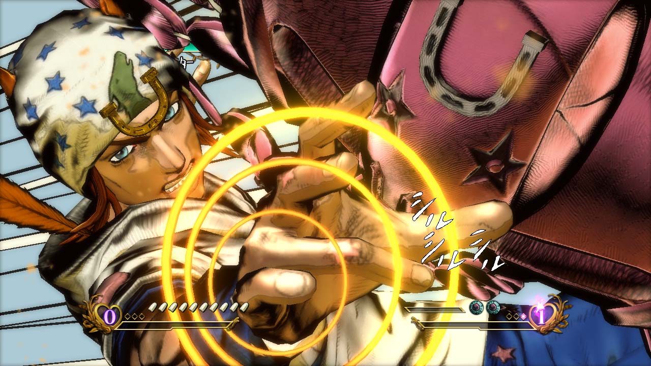 Description: A video game character holding a large object in his hand and pointing it at the camera with a yellow ring.