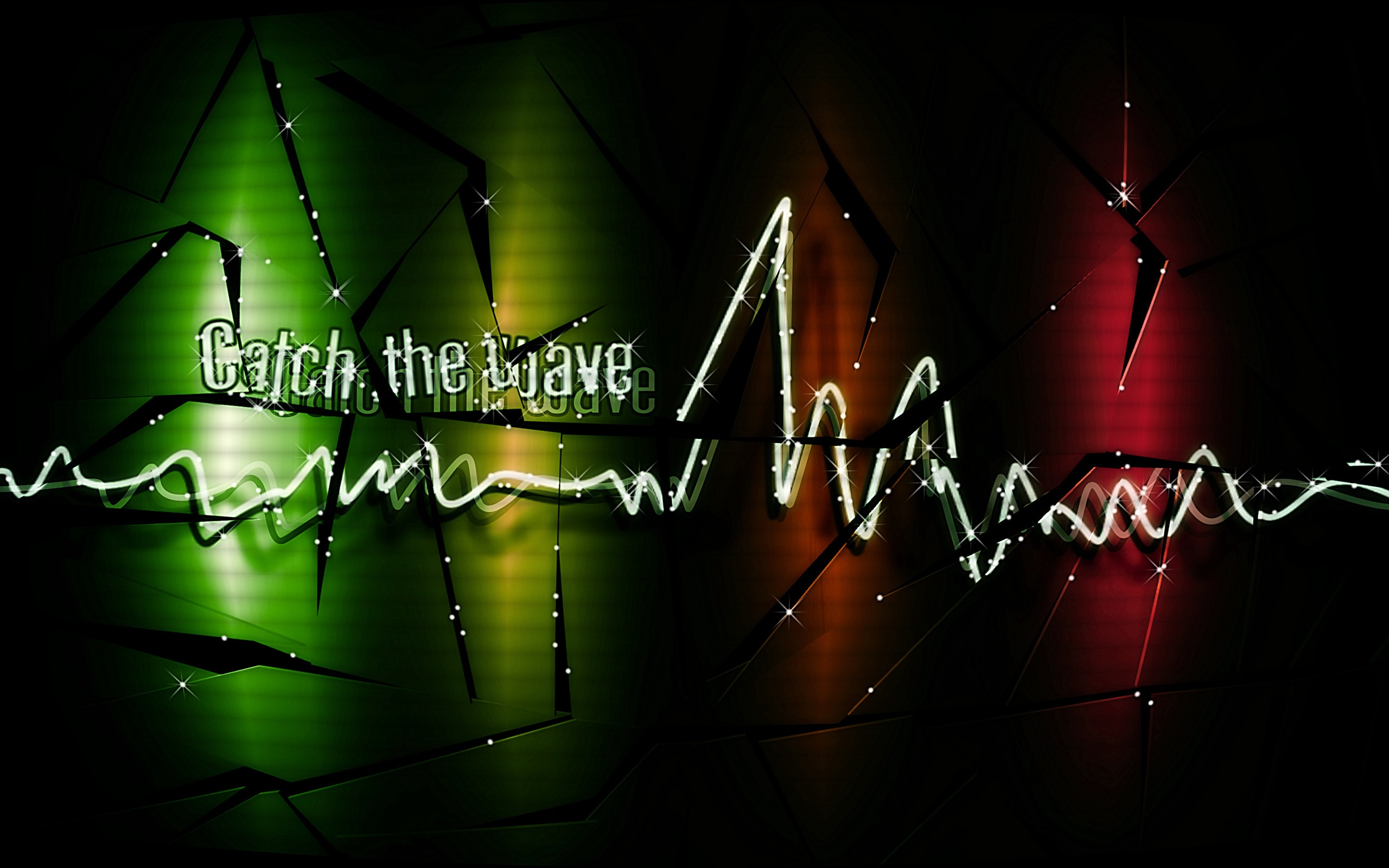 Description: A wall with a neon sign and a wave of lights in the background that says beach the wave.