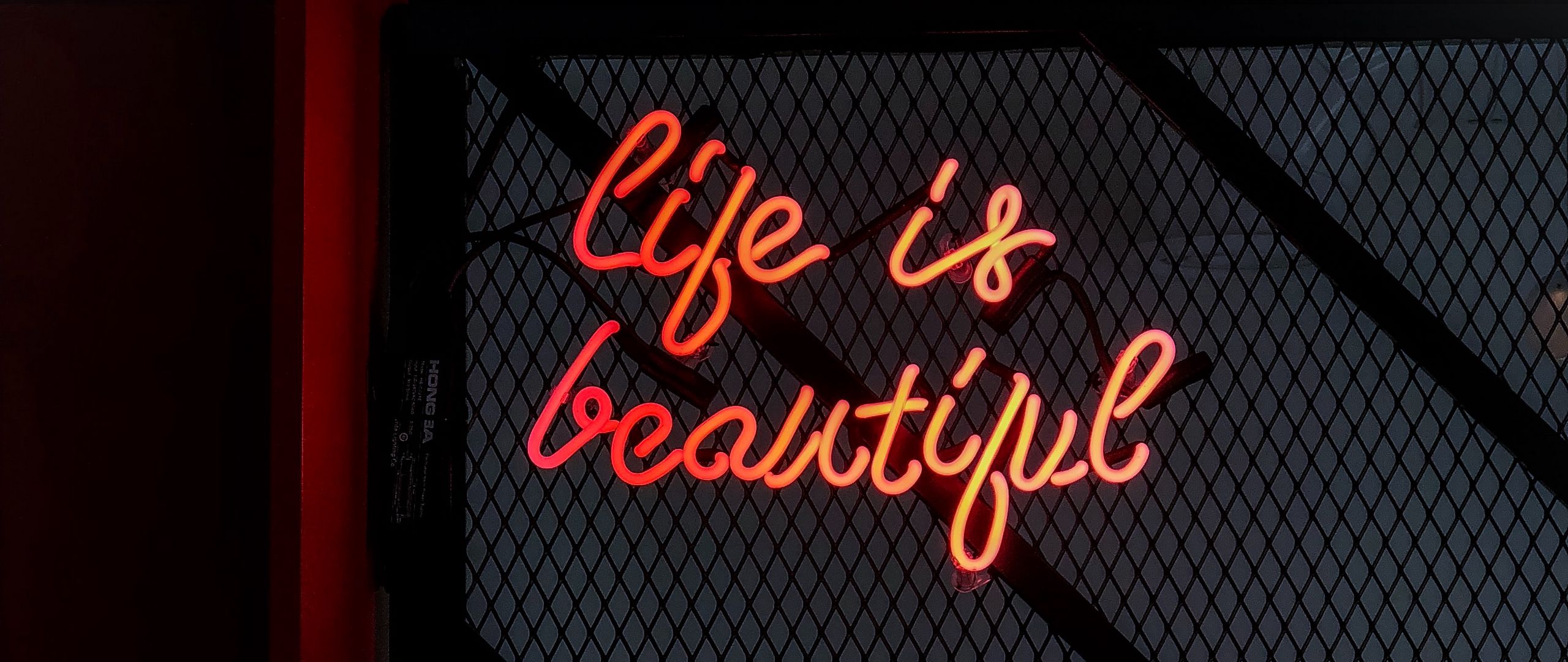 Description: A neon sign that says life is beautiful on a building wall in a city at night time.