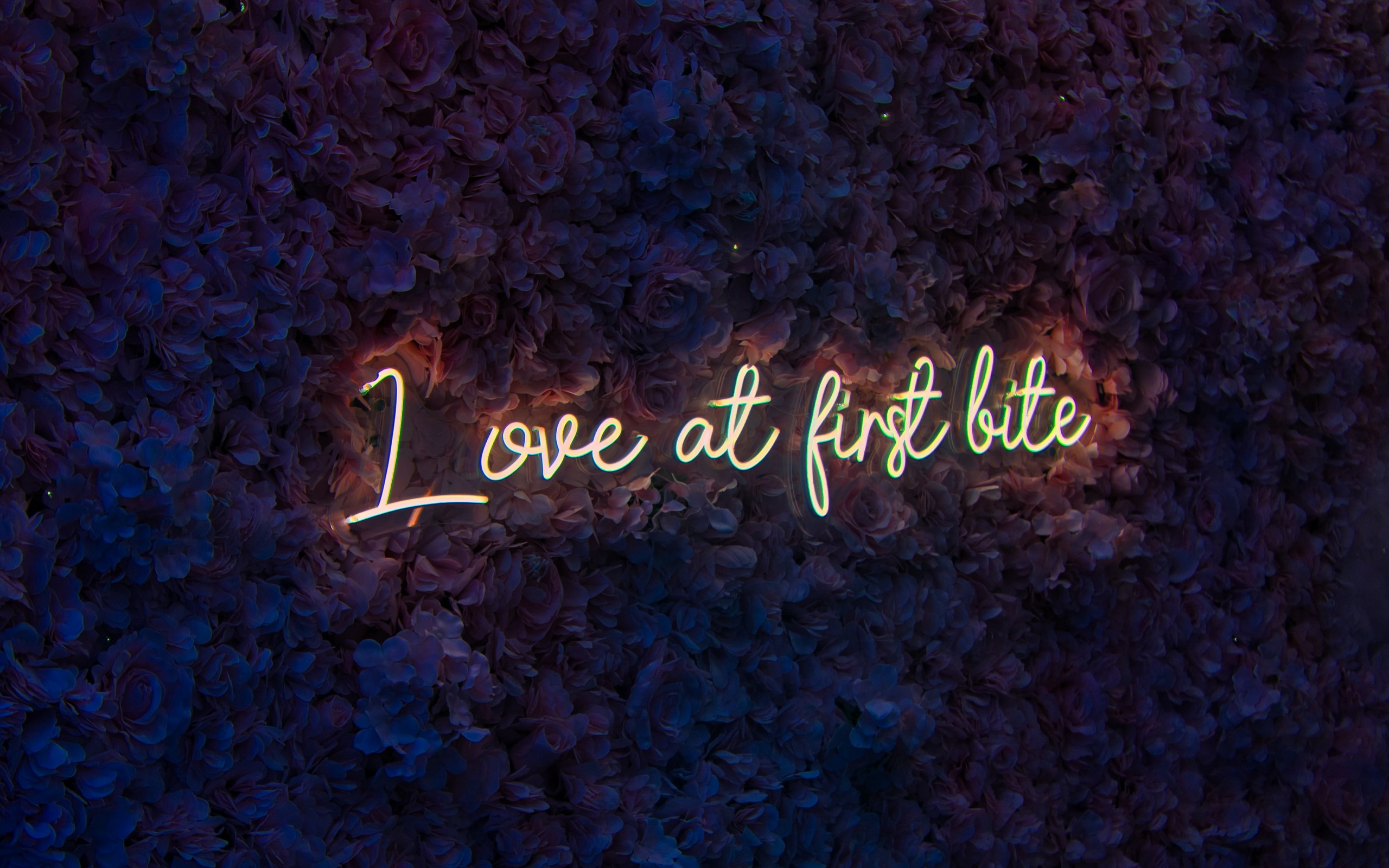 Description: A neon sign that says love at first bite on a wall of flowers in a garden of purple and blue.