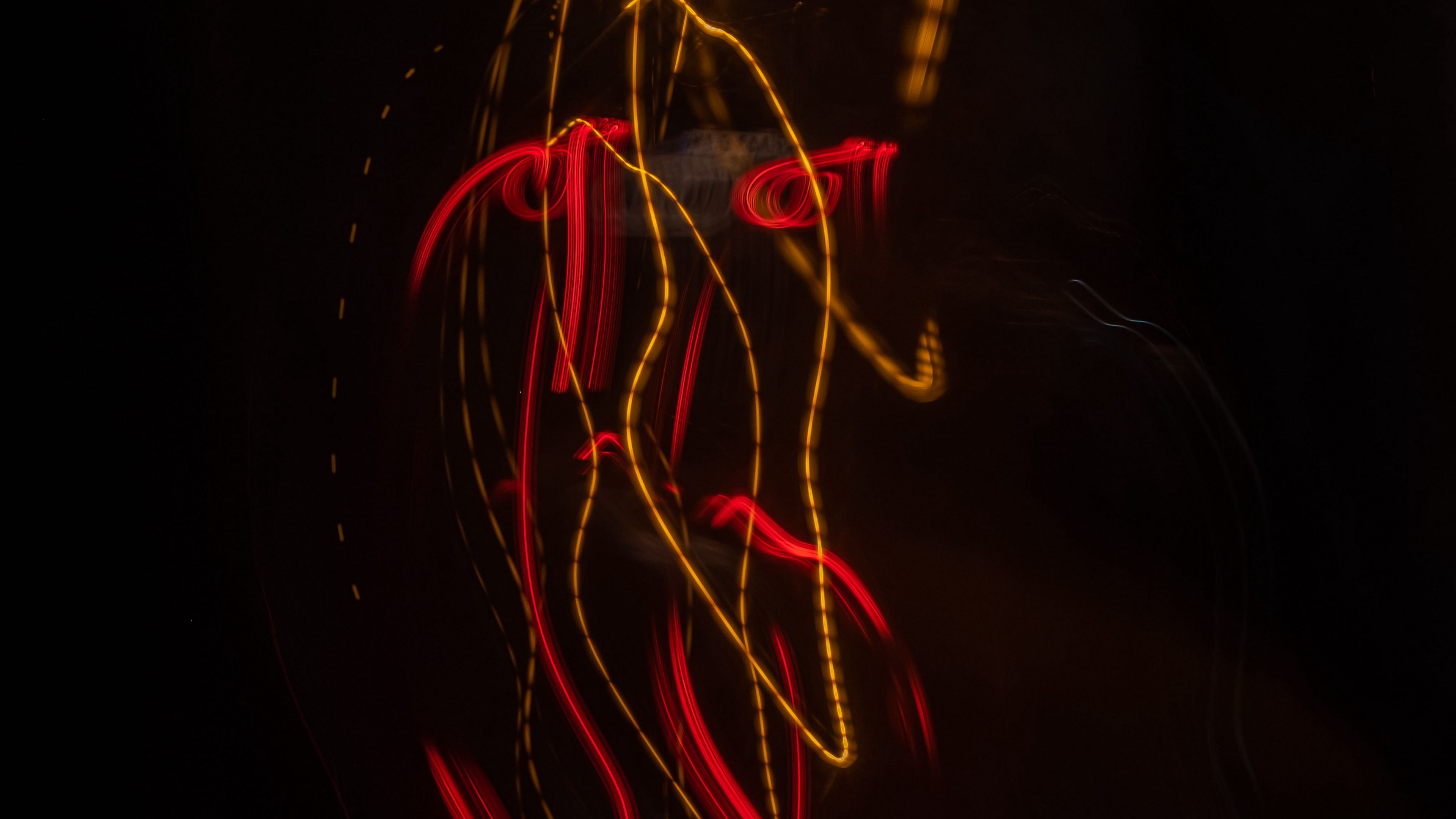 Description: A neon sign with a person on it in the dark with a red light on it's face.