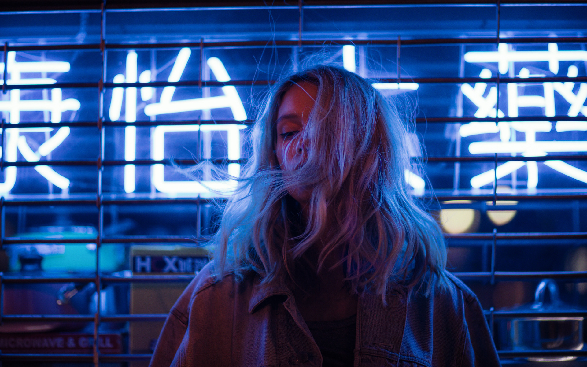 Description: A woman standing in front of a neon sign in a dark room with a blue light behind her and a blue light behind her.