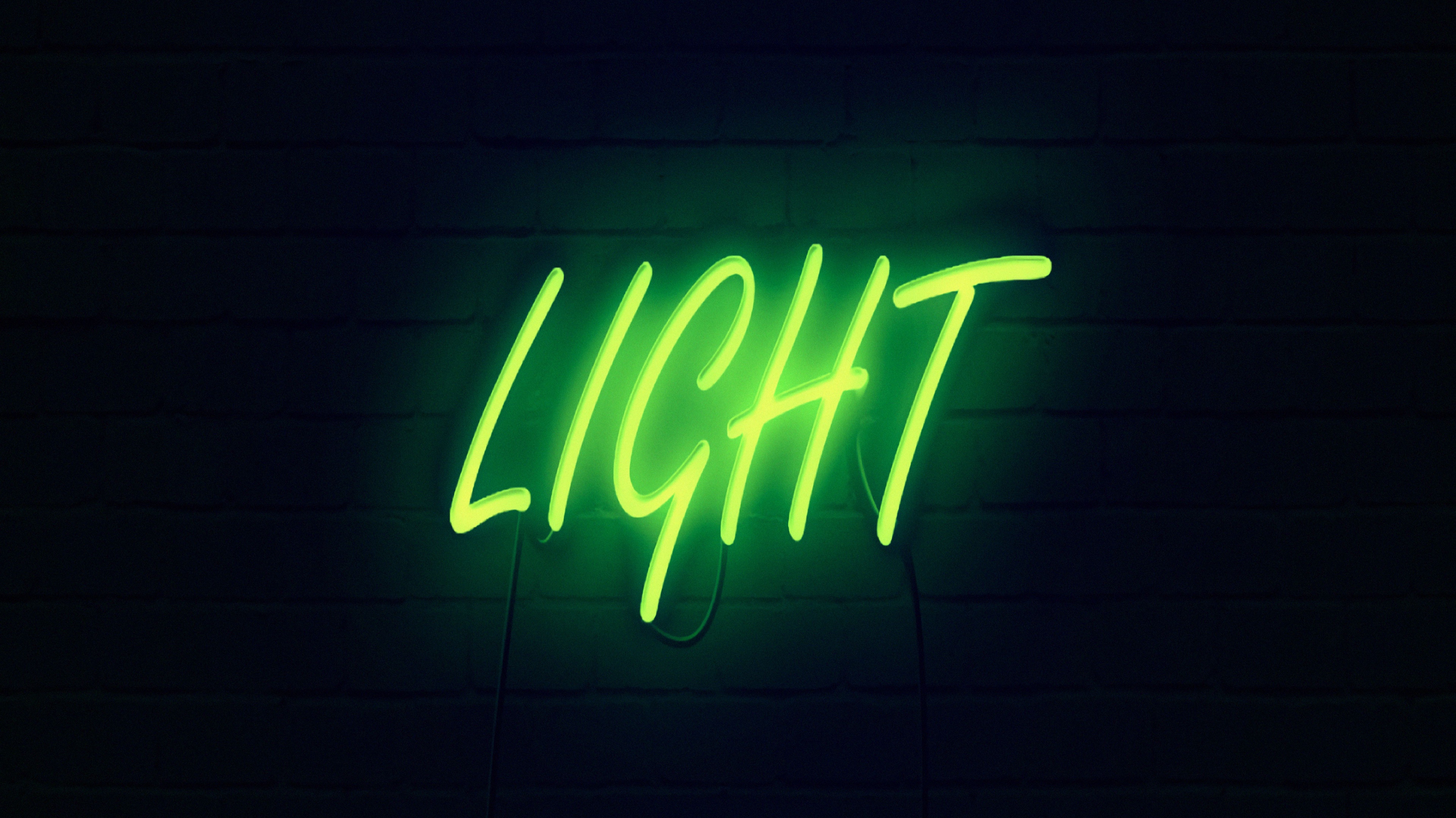 Description: A neon sign that reads light on a brick wall in a dark room with a brick wall behind it.