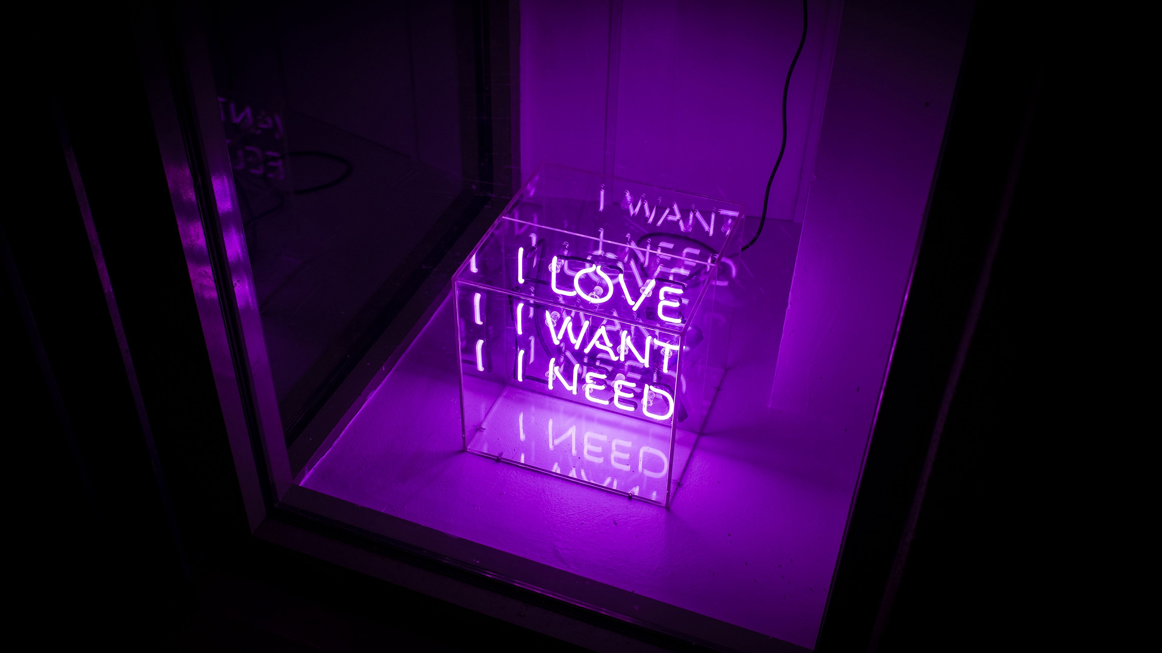 Description: A neon sign that says i want love i want i need i need you in a dark room with a mirror.